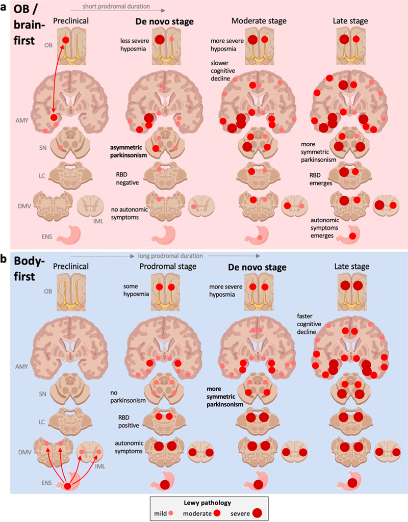 Figure 6. Analysis of the M/V 129 residue region of prion protein amyloid (APrP). a,b. Atomic models from patient 1 and 2. The 129 V residue (green) is tightly packed. c, d. This leaves little space for the larger methionine residue (reproduced with permission under the creative commons license from Hallinan et al., 2022). 7. APOE's role in chronic traumatic encephalopathy Chronic traumatic encephalopathy (CTE) results from mild yet repetitive traumatic brain injury that is often sustained during contact sports or in other contexts. While the association between this exogenous risk factor and resultant tauopathy and neurodegeneration is well established, not all participants in contact sports develop CTE. This suggests that other factors, perhaps genetic, might play a moderating role. One gene that has been implicated is APOE, which encodes the most abundant cholesterol transporter in the brain that is also the strongest genetic risk factor for sporadic AD. Previous studies have suggested that the APOEε4 allele may confer risk for a poor outcome following TBI, but the risk for CTE remains unclear. In a study by Atherton et al., investigators performed the largest study to date investigating the potential association between APOE and CTE (Atherton et al., 2022). The study was a cross sectional association analysis of 364 brain donors with repetitive head impacts exposure (i.e., contact sports or military service), with 294 positive and 70 negative for CTE. In addition to disease status, the investigators were able to explore a series of diseases relevant endophenotypes, including quantitative and semiquantitative tau pathology burden assessments. They found an association between tau pathology burden across multiple cortical regions and the amygdala as well as CTE stage among brain donors over 65 years of age at death. The presence of a APOEε4 was equivalent to 7 years of playing football. This association remained even after accounting for amyloid plaque status. These findings provide the strongest evidence to date that APOEε4 is a risk factor for CTE. 8. Unraveling genetic influences on microglia in neurodegeneration Understanding the contribution of microglia to the pathogenesis of degenerative brain disorders continues to increase in relevance. Microglia mediate numerous essential functions such as inflammation, injury repair, maintenance of brain networks, and neurodevelopment. They exhibit dynamic characteristics and can have distinct phenotypes and functions depending on environmental signals, brain regions, age, and disease pathologies. Previous studies have documented changes in microglial density, morphology, and gene expression in postmortem brain tissue from individuals with neurological and psychiatric disorders, suggesting their involvement in numerous disease processes. Recent genetic evidence has also strongly implicated myeloid cells, including microglia. To better understand the potential causal role of microglia and perhaps identify therapeutic targets, it is crucial to determine the genes influenced by disease-associated genetic variants. However, this is challenging due to the complex regulatory mechanisms involved, especially when considering variants located outside protein-coding regions. Integrating genetic and transcriptomic analyses can help identify quantitative trait loci (QTLs) and elucidate gene-gene variant relationships. Although recent efforts have detected expression QTLs (eQTLs) in microglia and their overlap with AD loci, larger sample sizes are needed. In a study conducted by Lopes et al., a team of researchers performed transcriptome analysis on 255 primary human microglial isolates obtained from multiple brain regions of 100 individuals obtained fresh at autopsy (Lopes et al., 2022). They investigated factors contributing to microglial heterogeneity, such as brain region and aging. Through mapping of expression and splicing quantitative trait loci, the study revealed that numerous susceptibility loci for neurological diseases are mediated by gene expression or splicing in microglia. Notably, the researchers identified candidate causal variants within microglia-specific enhancers, including associations between microglial expression of USP6NL and AD, as well as P2RY12 and Parkinson’s disease. Overall, this study provides a comprehensive catalog of genetic effects on the microglial transcriptome and presents potential functional variants relevant to neurological and psychiatric disorders. 9. A postmortem study examines the dual-hit hypothesis of Parkinson’s disease Pathoanatomically mapping the initiation and progression of Lewy body pathology through the brain is a critical aspect of our understanding of neurodegeneration. One hypothesis, first suggested by Braak and colleagues, is that there is a dual-hit, with simultaneous involvement of the olfactory bulb and dorsal motor nucleus of the vagus that underlies hyposmia and autonomic symptoms, respectively. Early studies had mandatory inclusion of Lewy pathology in the dorsal motor nucleus as an inclusion criterion, potentially biasing against cases with Lewy bodies in the olfactory bulb alone. Nevertheless, this hypothesis is debated and yet has spawned many clinical studies aimed at understanding potential initiating factors. Little work has been done to test the hypothesis in the neuropathological setting. In a study by Borghammer et al., investigators re-analyzed two large human post-mortem autopsy datasets that included mild Lewy body disease cases (Borghammer et al., 2022). They found that cases with alpha-synuclein immunopositivity in the peripheral autonomic nervous system and lower brainstem infrequently displayed pathology in the olfactory bulb (Figure 7). Conversely, cases with mild amygdala-predominant Lewy body pathology essentially always showed olfactory bulb pathology. Together, these findings suggest that the initiation of Lewy body pathology starts either in the olfactory bulb