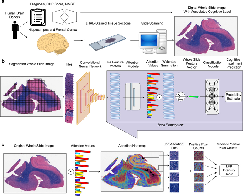 Figure 8. Multiple instance learning pipeline for whole slide image analysis. a. The whole slide image dataset was derived from aged human brain donors. b. Whole slide images are segmented into tiles and processed through a multiple instance learning pipeline. c. attention values are used to map salient features. (Reproduced with permission under the creative commons license from McKenzie et al., 2022). Acknowledgements This work was supported by funding from the NIH (R01AG054008, R01NS095252, R01AG062348, R01NS086736, U54NS115266, U54NS115322) as well as the Rainwater Charitable Trust/Tau Consortium, a Alexander Saint Amand Scholar Award, and a Karen Strauss Cook Research Scholar Award. Images have been reproduced under the creative commons license: visit http://creativecommons.org/licenses/by/4.0/. References 1. Atherton, K., Han, X., Chung, J., Cherry, J. D., Baucom, Z., Saltiel, N., Nair, E., Abdolmohammadi, B., Uretsky, M., Khan, M. M., Shea, C., Durape, S., Martin, B. M., Palmisano, J. N., Farrell, K., Nowinski, C. J., Alvarez, V. E., Dwyer, B., Daneshvar, D. H., … Mez, J. (2022). Association of APOE Genotypes and Chronic Traumatic Encephalopathy. JAMA Neurology, 79(8), 787–796. https://doi.org/10.1001/jamaneurol.2022.1634 2. Borghammer, P., Just, M. K., Horsager, J., Skjærbæk, C., Raunio, A., Kok, E. H., Savola, S., Murayama, S., Saito, Y., Myllykangas, L., & Van Den Berge, N. (2022). A postmortem study suggests a revision of the dual-hit hypothesis of Parkinson’s disease. NPJ Parkinson’s Disease, 8(1), 166. https://doi.org/10.1038/s41531-022-00436-2 3. Chang, A., Xiang, X., Wang, J., Lee, C., Arakhamia, T., Simjanoska, M., Wang, C., Carlomagno, Y., Zhang, G., Dhingra, S., Thierry, M., Perneel, J., Heeman, B., Forgrave, L. M., DeTure, M., DeMarco, M. L., Cook, C. N., Rademakers, R., Dickson, D. W., … Fitzpatrick, A. W. P. (2022). Homotypic fibrillization of TMEM106B across diverse neurodegenerative diseases. Cell, 185(8), 1346-1355.e15. https://doi.org/10.1016/j.cell.2022.02.026 4. Hallinan, G. I., Ozcan, K. A., Hoq, M. R., Cracco, L., Vago, F. S., Bharath, S. R., Li, D., Jacobsen, M., Doud, E. H., Mosley, A. L., Fernandez, A., Garringer, H. J., Jiang, W., Ghetti, B., & Vidal, R. (2022). Cryo-EM structures of prion protein filaments from Gerstmann-Sträussler-Scheinker disease. Acta Neuropathologica, 144(3), 509–520. https://doi.org/10.1007/s00401-022-02461-0 5. Jiang, Y. X., Cao, Q., Sawaya, M. R., Abskharon, R., Ge, P., DeTure, M., Dickson, D. W., Fu, J. Y., Ogorzalek Loo, R. R., Loo, J. A., & Eisenberg, D. S. (2022). Amyloid fibrils in FTLD-TDP are composed of TMEM106B and not TDP-43. Nature, 605(7909), 304–309. https://doi.org/10.1038/s41586-022-04670-9 6. Johnson, E. C. B., Carter, E. K., Dammer, E. B., Duong, D. M., Gerasimov, E. S., Liu, Y., Liu, J., Betarbet, R., Ping, L., Yin, L., Serrano, G. E., Beach, T. G., Peng, J., De Jager, P. L., Haroutunian, V., Zhang, B., Gaiteri, C., Bennett, D. A., Gearing, M., … Seyfried, N. T. (2022). Large-scale deep multi-layer analysis of Alzheimer’s disease brain reveals strong proteomic disease-related changes not observed at the RNA level. Nature Neuroscience, 25(2), 213–225. https://doi.org/10.1038/s41593-021-00999-y 7. Lopes, K. de P., Snijders, G. J. L., Humphrey, J., Allan, A., Sneeboer, M. A. M., Navarro, E., Schilder, B. M., Vialle, R. A., Parks, M., Missall, R., van Zuiden, W., Gigase, F. A. J., Kübler, R., van Berlekom, A. B., Hicks, E. M., Bӧttcher, C., Priller, J., Kahn, R. S., de Witte, L. D., & Raj, T. (2022). Genetic analysis of the human microglial transcriptome across brain regions, aging and disease pathologies. Nature Genetics, 54(1), 4–17. https://doi.org/10.1038/s41588-021-00976-y 8. Ma, X. R., Prudencio, M., Koike, Y., Vatsavayai, S. C., Kim, G., Harbinski, F., Briner, A., Rodriguez, C. M., Guo, C., Akiyama, T., Schmidt, H. B., Cummings, B. B., Wyatt, D. W., Kurylo, K., Miller, G., Mekhoubad, S., Sallee, N., Mekonnen, G., Ganser, L., … Gitler, A. D. (2022). TDP-43 represses cryptic exon inclusion in the FTD-ALS gene UNC13A. Nature, 603(7899), 124–130. https://doi.org/10.1038/s41586-022-04424-7 9. McKenzie, A. T., Marx, G. A., Koenigsberg, D., Sawyer, M., Iida, M. A., Walker, J. M., Richardson, T. E., Campanella, G., Attems, J., McKee, A. C., Stein, T. D., Fuchs, T. J., White, C. L., PART working group, Farrell, K., & Crary, J. F. (2022). Interpretable deep learning of myelin histopathology in age-related cognitive impairment. Acta Neuropathologica Communications, 10(1), 131. https://doi.org/10.1186/s40478-022-01425-5 10. Nelson, P. T., Brayne, C., Flanagan, M. E., Abner, E. L., Agrawal, S., Attems, J., Castellani, R. J., Corrada, M. M., Cykowski, M. D., Di, J., Dickson, D. W., Dugger, B. N., Ervin, J. F., Fleming, J., Graff-Radford, J., Grinberg, L. T., Hokkanen, S. R. K., Hunter, S., Kapasi, A., … Schneider, J. A. (2022). Frequency of LATE neuropathologic change across the spectrum of Alzheimer’s disease neuropathology: Combined data from 13 community-based or population-based autopsy cohorts. Acta Neuropathologica, 144(1), 27–44. https://doi.org/10.1007/s00401-022-02444-1 11. Roemer, S. F., Grinberg, L. T., Crary, J. F., Seeley, W. W., McKee, A. C., Kovacs, G. G., Beach, T. G., Duyckaerts, C., Ferrer, I. A., Gelpi, E., Lee, E. B., Revesz, T., White, C. L., Yoshida, M., Pereira, F. L., Whitney, K., Ghayal, N. B., & Dickson, D. W. (2022). Rainwater Charitable Foundation criteria for the neuropathologic diagnosis progressive supranuclear palsy. Acta Neuropathologica,144(4), 603-614. https://doi.org/10.1007/s00401-022-02479-4 12. Schweighauser, M., Arseni, D., Bacioglu, M., Huang, M., Lövestam, S., Shi, Y., Yang, Y., Zhang, W., Kotecha, A., Garringer, H. J., Vidal, R., Hallinan, G. I., Newell, K. L., Tarutani, A., Murayama, S., Miyazaki, M., Saito, Y., Yoshida, M., Hasegawa, K., … Scheres, S. H. W. (2022). Age-dependent formation of TMEM106B amyloid filaments in human brains. Natu
