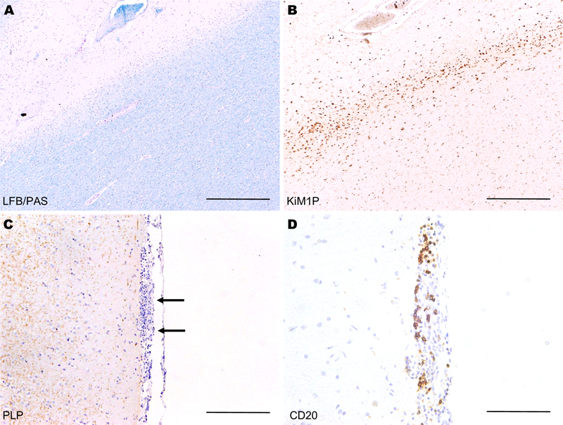 Introduction Neurodegeneration and worsening of clinical disability in progressive multiple sclerosis (MS) occur independently from newly formed, acute inflammatory lesions characterized by MRI contrast enhancement [34]. Pathological findings in progressive MS include so-called slowly expanding lesions, meaning white matter demyelinated lesions with slow expansion at their lesion edge, as well as extensive cortical demyelination and diffuse white matter injury (Figure 1 A-C) [21, 39]. In contrast to relapsing remitting MS, the inflammation in progressive MS becomes trapped or compartmentalized behind a closed blood-brain barrier, and typically no MRI lesion enhancement is observed [11, 34]. A close association between inflammation and neurodegeneration is also evident in progressive MS [20]. A profound microglial activation and meningeal lymphoid structures are associated with tissue injury and demyelination (Figure 1 B-D) [28, 40]. The inflammation causes a widespread neuroaxonal loss not only in white matter lesions, but also in normal-appearing white matter as well as in cortical and deep gray matter [11, 41]. This neuroaxonal loss is thought to be the major cause of progressive, irreversible neurological disability in patients with progressive MS. Therefore, treatment of progressive MS needs to target the compartmentalized CNS inflammation in order to slow down neurodegeneration and disease progression. Figure 1: Histological findings in progressive multiple sclerosis