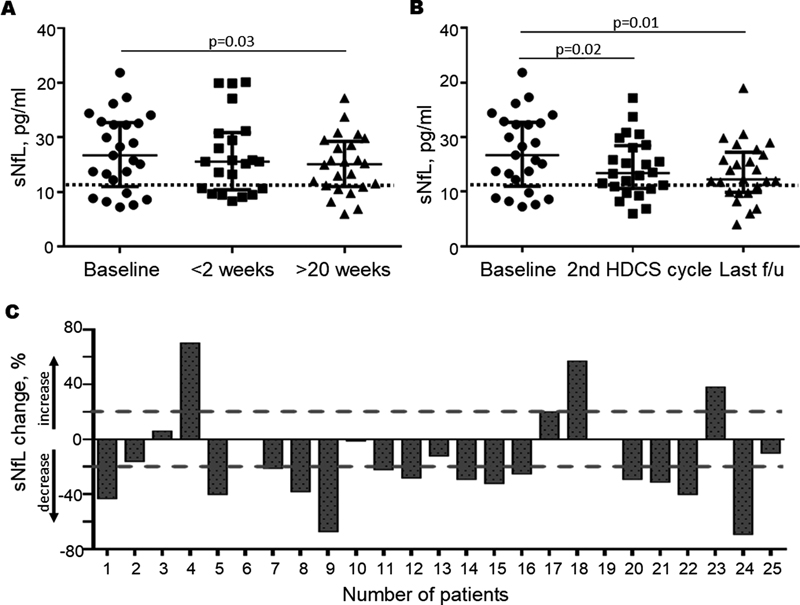 sNfL levels decrease after HDCS therapy sNfL baseline levels were significantly higher in progressive MS patients compared to age-matched healthy controls (median 16.7 pg/ml vs 11.5 pg/ml, p=0.002). Within the first two weeks after baseline HDCS therapy, the median sNfL level was not significantly reduced (median 15.6 pg/ml, p=0.7). However, ≥20 weeks after baseline HDCS therapy the majority of patients (72%, 16/23) showed reduced sNfL levels compared to baseline (median 13.3 pg/ml, p=0.03) (Figure 2A). The median sNfL level was still higher compared to the healthy control cohort, but these differences no longer reached statistical significance. Pairwise comparison of sNfL levels at baseline, subsequent HDCS cycle (2nd cycle during the study) as well as at last follow-up revealed that even more patients (76%, 19/25) had reduced sNfL levels. sNfL levels showed a median reduction of 22% at last follow-up compared to baseline sNfL values (p=0.01) (Figure 2B). This effect was also observed when excluding the 5 patients treated with DMTs (p=0.001; data not shown), indicating that the sNfL reduction is not due to DMT treatment. Although in individual patients a 20% reduction of sNfL levels may be regarded as natural fluctuation [8], on a group level this reduction seems relevant. Individual changes in sNfL levels are shown in Figure 2C. The percentage change of sNfL levels comparing values from baseline and last follow-up for all patients included in the study are given. Fourteen patients (56%) had a reduction in sNfL levels >20% (Figure 2C), with some patients showing a decrease of sNfL levels up to 50% from baseline. In three patients, sNfL levels increased >20%. Clinical history could not reveal any reason for these increases. Figure 2: Reduction of sNfL levels in progressive MS patients treated with HDCS