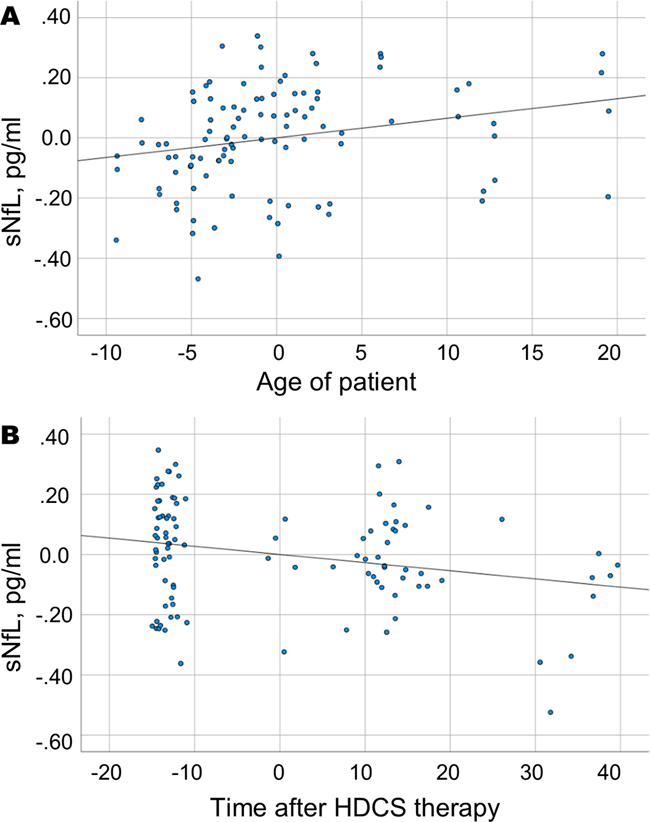 The dependent variable is the sNfL level. Independent variables are the age of patients at the time of blood sampling (A) and the time that passed after the baseline HDCS therapy (B). Due to calculations with multiple variables, the scaling of axes differs from normal units and does not seem plausible. sNfL levels correlate positively with the age of patients (A, p=0.003) and shows a negative correlation with the time that passed after the baseline HDCS therapy (B, p=0.03), indicating a reduction in sNfL levels due to HDCS treatment. Table 3: Model to explain sNfL levels in patients after HDCS therapy
