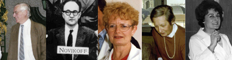 Figure 1: From left to right: Dean Pascal Brunet, Alex Novikoff, Jeanne-Marie Boutry, Françoise Cathala in her office at La Salpêtrière, and Miss Besse, influential secretary of Dean Paul Castaigne. How did a young student in neurology fall into research (nerve tissue culture)? In the Neurosurgery Department of Professor Marcel David, a neurologist, Dr. Elie Bernard-Weil told me one day (yet another stroke of luck!): “I've invented a treatment that allows damaged nerve tissue to regenerate. I'm looking for someone to study it. Would you like to do it on nerve tissue cultures in a research laboratory: the Service de Physiopathologie Cellulaire (Department of Cellular Physiopathology) of Saint-Antoine hospital in Paris?” Of course! It was a turning point. In Doctor Roger Robineaux's laboratory (part of the new research association “Association Claude Bernard pour la Recherche Médicale”), I was given an exceptionally warm welcome by all the members of the teams, including a researcher from the Centre National de la Recherche Scientifique (CNRS), Pierre Goube de Laforest. I learned from them a wide range of tissue culture techniques (of cells: "histiotypic", of organs with migration of certain cells around the explant: "organized", of organs without this cell migration: "organotypic", now called "organoids”) and first applied them to nerve tissue from chicken embryos (one of the least expensive to obtain). I also learned how to study them "in vitro" by phase contrast (or Nomarski) differential interference contrast (DIC) and microcinema or by light and electron microscopy [9]. This made it possible to study both nerve growth factors and the toxicity of certain molecules (e.g., lipidosis induced by some drugs) [10]. I used to go there every afternoon, except for those devoted to internship boarding duty, to the psychology courses I followed, and to the histology tutorials I was giving to young students at the Paris Faculty of Medicine under the supervision of Professor Christian Da Lage for financial reasons (which turned out to be another stroke of luck!). With the help of two women researchers, who were culturing kidneys and livers from human stem cells derived from aborted fetuses, I was able to grow human cerebellar tissue [11]. Ethical issues were quite different in the 1960s! When I asked Pierre Goube de Laforest about human fetal tissue culture, he replied: "I don't see any problem", and, the following week: "I asked around: should we not baptize the fetus before harvesting it, and culturing its nervous tissue?" Among the Doctor Roger Robineaux's laboratory's researchers, two Americans on sabbatical became interested in my nerve tissue cultures. They were Alex Novikoff (Fig 1) and his wife, Phyllis. They used electron microscopy to study lysosomes, recently described by Christian de Duve. They studied the relationship between the neuronal Golgi apparatus and lysosomes. They were helped by an exceptional technician, Jeanne-Marie Boutry (Fig 1), whom they later brought to New York for a year [12-13]. A few years later, they invited me to New York, where I met the American neuropathologist Robert Terry [14] at the Albert Einstein College of Medicine, solidifying my orientation towards neuropathology. How did a young student in neurology fall into neuropathology? A few months later, I met another researcher in Roger Robineaux's laboratory, Françoise Cathala (another stroke of luck!) (Fig 1). She was an exceptional woman - an unconventional neurologist and virologist, very passionate, brilliant, and enthusiastic, but often little understood (even despised) by her colleagues. Clearly interested in my nerve tissue cultures, she whispered to me: "Did you know that an internship position in neuropathology has just been created at La Salpêtrière Hospital in Professor Raymond Escourolle’s new Neuropathology Department? It is alongside Professor Castaigne’s department, just above my virology laboratory. You would be able to perform your nerve tissue cultures there. As no one is yet aware of this new position, you have a great chance of getting the job." Françoise Cathala was right: I realized my dream of becoming an intern at La Salpêtrière. And that's where I met the world of neuropathology with which I was completely unfamiliar, as my training had only included internal medicine, neurology, psychiatry, surgery, and neurosurgery. Neuropathology at La Salpêtrière and La Pitié Hospitals (Paris) in the late 1960s The situation of neuropathology wasn’t simple. The adjacent hospitals La Pitié and La Salpêtrière were still distinct. Initially, there were four different small laboratories ("laboratoires de service") attached to clinical departments [6]. Two were part of the Neurology Departments. The Charles Foix laboratory was headed by Raymond Escourolle (Fig 2, 4 and 6) and belonged to the “Clinique du Système nerveux” headed by the Dean Paul Castaigne (Fig 2) and his very influential secretary, Miss Besse (Fig 1) [4]. His numerous assistants included Pascal Brunet (another lucky break: Miss Besse appreciated Pascal Brunet and helped me in any way she could). When I joined as a resident, this laboratory also carried out neuropathology procedures for the neurological clinics run by Professors André Buge and François Lhermitte. The other neuropathology laboratory of the Neurology Department was located at the “Clinique neurologique” of La Salpêtrière and was headed by Raymond Garcin, followed by Georges Boudin (managed by Michel Fardeau, Jean Lapresle, Jacqueline Mikol, and others) [5,15]. The two other neuropathology laboratories were part of the Neurosurgery Department. One was located at La Salpêtrière (in the department of Professor Jacques Lebeau, successor to Jean-Marie Guillaume who established it in 1942, with the neuropathologist Jean-François Foncin, successor to Jean-Emmanuel Grüner). The other was located at La Pitié Hospital in the Neurosur