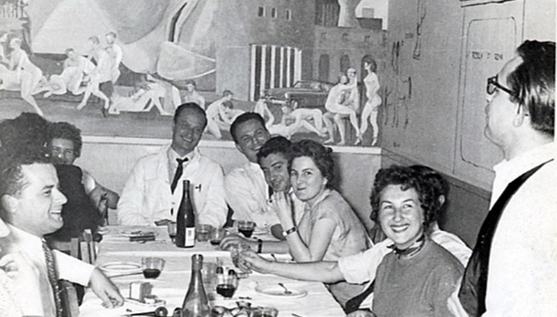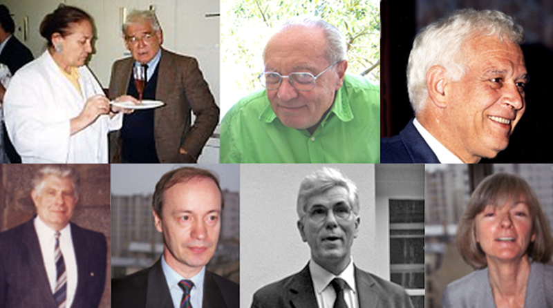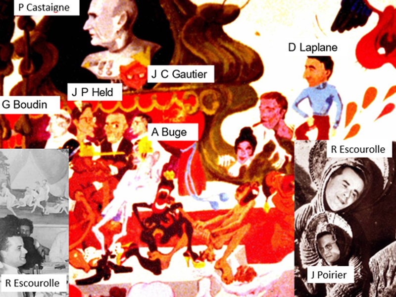Figure 3: From left to right. Above: Nicole Baumann with Gérard Percheron; Jacques Poirier; Jean-Louis Signoret. Below: General Louis Court; Dominique Dormont; Charles Duyckaerts and Annick Alpérovitch. An internship at La Salpêtrière: the guardroom The residents (“internes”) had some advantages, the most significant of which was the use of the guardroom (“Salle de Garde”). They slept there when they were on night duty and, most importantly, had lunch there whenever they wanted. “Frescoes" decorated the guardroom. These were murals, mostly erotic cartoons, depicting the hospital doctors (Fig 4-6) [17]. After a few introductory rites, the “Salle de Garde” was an opportunity to meet the other interns, the foreign trainees and also the so-called "fossils" that became “dinosaurs” when older. These were the former residents who continued to frequent the guardroom and performed the rituals there ("welcoming newcomers", "bawdy guardroom songs”, etc.). One of the most addicted to the Salle de Garde was the neuropathologist Jean-François Foncin, whom I met there before becoming a fossil myself. He was a remarkable singer, a great specialist in "Chansons de salle de Garde" (guardroom songs), which are usually erotic and divisive.