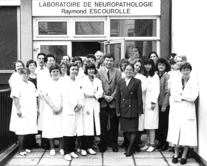 I'm going to explain how and why I fell into the Department of Neuropathology at the Pitié-Salpêtrière Hospital of Paris. I'd also like to sketch the history of French neuropathology in the years 1960-2010, as seen by a naive young student, and then by a practicing neuropathologist (often still very naive). As a matter of fact, although the history of neurosciences [1-2] and the Pitié-Salpêtrière Hospital in Paris [3-4] have been the subject of numerous publications, the history of neuropathology in this hospital has been rarely documented [5-6]. I spent more than forty years strolling along the alleys of La Salpêtrière, among its old pavilions, the Saint Louis chapel, the “Pavillon des folles”, the courtyard of Manon Lescaut and the guard room. I worked full-time between the Escourolle laboratory, the “Amphithéâtre des morts” and the University. It has been a real pleasure to be part of this world. I would also like to offer young doctors in training and future neuropathologists some advice that might help them in the choice and development of their future careers. How did I turn to medicine? I was raised by devoted parents, teachers of English and Economics in secondary school and technical education, who had managed to move close to Paris (from Boulogne-Sur-Mer in the north of France, to Dreux, then to Versailles) so that their children could study there. Actually, most of my career followed a succession of accidents. Before I chose my future profession, I hesitated between Sciences Politiques School (humanities and social sciences) and Medicine. As my first stroke of luck, I missed the registration to Sciences Politiques, so I registered to Medicine. In fact, I registered to a pre-training year which included practical work (microscope examination, dissection, etc.). As chance would have it, I was seated next to fellow student Claude-François Degos, whose father was a "Grand Patron" and a Professor of Medicine at Paris University. I heard him talking with one of his friends about his future career: “to access a bright future, one would have to prepare for competitive examinations to become an "extern" [7] and then an "intern" (resident) (paid functions I had never heard of).” The best way to do so would be to follow the “conferences for externship and then those for internship (training courses given by young pedagogical doctors).” That is what I did. It paid. I passed the externship competition. And then, I was lucky enough to be accepted into one of Dr. Jean-Claude Hesse’s internships, one of the best conferences. Thanks to him, I successfully passed the boarding school competition. How did a young student turn to neurology? Every morning except Sunday, “externs” examined selected patients of their department and drew up their files under the supervision of “interns” and other doctors. Each 6-month “externship” was chosen on the basis of the year in which the student passed the competition and his admission rank. I started my externship at the Raymond Poincaré Hospital in Garches, a suburb of Paris (near Versailles, where I lived with my parents), in Doctor Jean Benassy's Neuro-rehabilitation Department. More specifically, it turned out to be a ward for tetraplegic patients. It was an emotional shock and perhaps the origin of my vocation. Another stroke of luck: a year later, when I was ending another externship in medical consultation at Boucicaut Hospital in Paris, Dr. Pierre Thiroloix, who oversaw this sector, kindly asked me: “What specialty would you like to do?” I answered, “Neurology.” He recommended me to Professor Pascal Brunet (Fig 1) at La Salpêtrière Hospital, who proved to be an excellent mentor throughout my whole career. Following his advice, I did one externship in neurology in Professor Paul Castaigne’s and an additional one in Professor François Lhermitte’s department at La Salpêtrière Hospital. I began my residency in internal medicine and then transitioned to neurosurgery (a specialty for which I obviously had no talent!) in Professor Marcel David’s department at La Pitié Hospital [8]. At the same time, I began studying psychology at the Universities of Nanterre and Paris.
