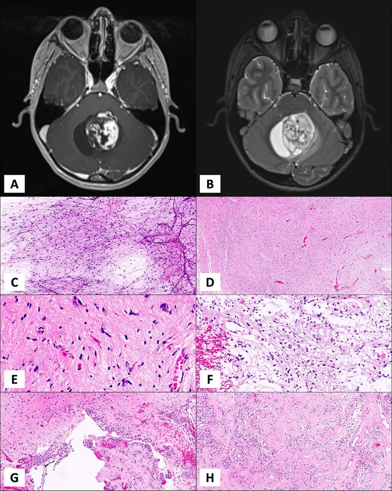 Figure 1. A cystic tumor with mural nodule in posterior fossa on axial T1 post-contrast (A) and T2 (B) weighted MRI images. An intraoperative smear slide of a PA case with plenty of piloid cells distributed on a glial background (C). Hematoxylin & eosin image of a demonstrative PA case with an overall fibrillary appearance (D), Closer view with plenty of Rosenthal fibers, classical finding in PAs (E). Myxoid, loose areas are another common finding in PA (F). Linear glomeruloid vascular structures are commonly observed (G) along with hyalinized, thick vessels (H). PA can be observed at any age with a reported incidence rate of approximately 0.84 per 100,000 [4-6], and has a favorable outcome [5]. Despite being the most common glioma among the pediatric population, overall rarity of this neoplasm makes it an orphan disease as well as a “chronic disease” affecting patients and families for many years, creating challenges in its management [7-11]. Coding of PAs in tumor registries has been problematic in recent years due to their designation as “malignant” in some countries. This change was made in order to capture these tumors in cancer registries [12]. Consequently, incidence of benign or malignant pediatric brain tumors show significant variations over time in epidemiological analyses [13]. We are not sure whether designating PAs as “malignant” in order to capture them in registries is a good idea, or whether this practice should be abandoned to bring more clarity and uniformity to the issue worldwide, but risk losing their identification in cancer statistics. PA is most commonly located in the posterior fossa, specifically in cerebellar hemispheres. Other common locations include hypothalamic/chiasmatic region and the optic nerve, the latter being particularly common in the setting of Neurofibromatosis 1 syndrome [14]. Thalamic, cerebral, and spinal tumors are distinctly less common [5]. Some authors suggested that there were prognostic differences among PAs in different locations that could not be explained simply by differences in clinical variables [15-17]. It is not clear whether different locations are associated with different outcomes beyond access to gross total resection, and whether tumor location is associated with different driver mutations and treatment response. In addition to location, some studies suggest that age is important determinant of outcome, and adult and pediatric PAs do not have similar prognoses [18-21]. PAs can have diverse morphological features, some of which may result in misclassification of some tumors as diffuse gliomas. Some PAs with the so-called “diffuse pilocytic pattern” may be easily misdiagnosed as diffuse gliomas [22]. Conversely, other entities may also be misclassified as PA and some high-grade tumors with remote resemblance to PA may be erroneously classified as tumors with piloid features or simply anaplastic PA [23]. High-grade histological features in otherwise typical PAs are also problematic and the current WHO classification scheme did not find sufficient evidence to define an anaplastic subtype [24]. However, there is clear evidence that rare PAs behave aggressively and some of these tumors may be justifiably designated as high-grade gliomas [25]. On the other hand, some worrisome histological features in PA have not been associated with adverse prognosis [26-28]. Additional studies and observations are needed to validate a high-grade subtype of PA and its definition. Currently, the only recognized subtype of PA is the pilomyxoid astrocytoma (PMA), that appears to be more aggressive compared to typical PAs [29]. However, in the recent editions of the WHO classification of central nervous system (CNS) tumors, the working groups decided that the data for recognizing this subtype as more aggressive were not sufficient to designate a specific WHO grade for PMA [15, 29, 30]. Further studies are needed for the pilomyxoid tumors to allow their grading and prognostication. Recent genomic studies outline the molecular landscape of PAs as tumors with a very stable genome, carrying less than 0.1 mutations per megabase [31, 32]. Mitogen activated protein kinase (MAPK) pathway is the most commonly affected pathway in PAs. The most common genetic alteration is the BRAF internal tandem duplication resulting with a fusion of a neighboring gene, KIAA1549. Other alterations of the MAPK pathway, such as other BRAF fusions, mutations in BRAF, RAS or NF1 were also reported [2, 33-39]. While the type of MAPK alterations has not been associated with different outcomes, it is not clear whether the cumulative effect of multiple genetic alterations may lead to a more aggressive behavior in PAs. Some studies implicated molecular alterations such as loss of CDKN2A, gain of chromosome 7 and loss of chromosome 17q as being associated with worse outcome, but none of these studies were validated in large series, prospective trials or by more than one group [25, 40]. Several clinical and biological markers reportedly influence prognosis in patients with PA, but these parameters, with the exception of extent of resection, have not been consistently found as independent variables [26-28, 41]. We also suggested that access to healthcare is a key factor in the outcome of patients with PA, most likely unrelated to tumor biology [42]. In this retrospective study, we report our experience with 499 PAs diagnosed and treated in a single institution over the last three decades in order to bring clarity to some of the uncertainties mentioned above, and to further demonstrate the need for collaborative studies and larger series to better understand factors associated with outcome. Material and Methods Patient selection All patients diagnosed as PA or PMA between 1989 and 2019, were retrieved from the pathology archives of the Department of Pathology. The inclusion criteria were as follows: 1- all patients diagnosed and/or treated at our institution between 1989 an