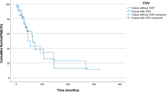 Figure 2. Recurrence-Free Survival in Patients with Pilocytic Astrocytoma, Stratified by Presence of Copy Number Variations (CNV: Copy number variation). We have also analyzed impact of chromosomal losses and gains separately. Partial and/or whole chromosomal loss was detected in 23 patients; of which, 8 was whole chromosomal loss. Partial and/or whole chromosomal gain was observed in 34 patients; of which 23 was whole chromosomal gains. Cases with any degree of chromosomal loss had a median RFS of 63 months whereas, it was 54 months for cases without any chromosomal losses. On the other hand, cases with chromosomal gain of any size had a median RFS of 63 months, whereas it was 54 months for cases without any chromosomal gains. No significant influence of whole chromosomal losses or gains was seen on recurrence, RFS and underlying molecular features of the tumor as well. Previous studies proposed whole chromosomal gains as an age-associated alteration without an impact on outcome [45]. There were 14 cases with whole chromosomal gains with no other CNV. Thus, we excluded these cases and conducted the analysis on the remaining 25. The results showed no statistically significant difference between cases with or without CNV (excluding whole chromosomal gains). Impact of age on recurrence-free survival The recurrence rates for patients younger than 14 years, between 14 and 21 years, and 21 years and over were 40.9%, 34.6%, and 20.4%, respectively. Although the recurrence rates are higher in the youngest age group, this difference was not statistically significant. (p=0.003). Among patients who underwent subtotal resection, patients older than 21 years at diagnosis showed higher recurrence rates (p<0.001), while there was no difference between age groups among patients who underwent GTR. We further investigated the confounding factors on the difference in STR group and included tumor location; even after including tumor location as a variable, patients >21 years of age showed a significantly higher recurrence rate (p<0.001). Impact of extent of resection on recurrence-free survival One-hundred-sixty-nine (33.9%) patients underwent GTR and 235 (47.1%) had STR. The data on the extent of surgery was missing in 95 (19.0%) cases. Recurrence rates were 8.5% and 20% for patients who underwent GTR and STR, respectively. The mean RFS was 321 months for patients who underwent GTR (CI: 292.3 – 350.1), and 160.9 months (CI:124.5 – 197.4) for patients who underwent STR. The patients with GTR have a significantly longer recurrence-free survival (RFS) compared to those with STR (log rank p <0.001, Figure 3). The median survival probability for overall survival could not be calculated due to absence of effect of extension of surgery on overall survival.