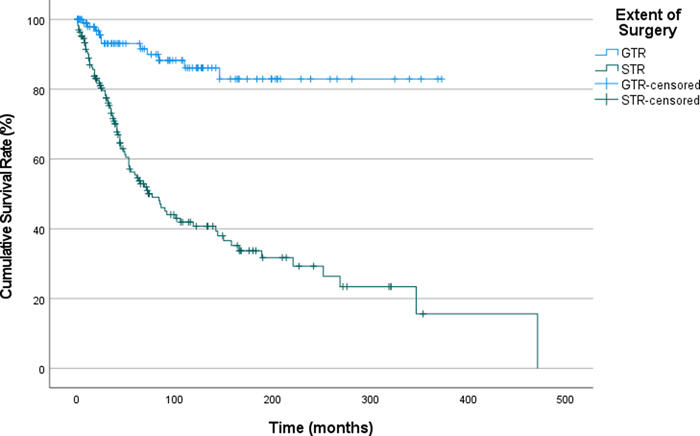 Figure 4. Subgroup Analysis of Recurrence-Free Survival in Patients with Pilocytic Astrocytoma Followed for >60 Months, Stratified by the Extent of Surgical Resection (GTR: Gross total resection, STR: Subtotal resection). After conducting a multivariate analysis of RFS considering the age groups, extent of resection, tumor location, NF1 status, and treatment modalities, we found that only the extent of resection had a statistically significant association with RFS (Table 7). Table 7. Multivariate analysis of factors for recurrence free survival probability