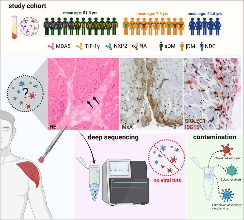 Introduction Although the pathogenesis of DM is not completely understood, it is well established that type I IFN plays a key role in both juvenile and adult DM. The IFN response can be defined by a specific up-regulation of IFN-stimulated molecules such as ISG15 or MxA and is comparable to that found in lupus erythematosus (SLE) and certain inherited interferonopathies, but also in viral infections [10]. In fact, parvovirus B19, coxsackie virus, polyomavirus, Epstein-Barr virus (EBV), influenza virus, human immunodeficiency virus (HIV), and SARS-CoV-2 have been associated with DM onset [3]. Since the detection of specific autoantibodies, such as anti-Mi-2, anti-TIF-1γ, anti-NXP2, anti-SAE, and anti-MDA5, the spectrum of DM can be defined more precisely regarding prognosis and clinical course such as risk of cancer development [27]. DM subtype-specific investigation of type I IFN-regulated transcripts identified a set of significantly dysregulated genes in muscle biopsies derived from anti-TIF-1γ+ patients [4]. Moreover, MDA5, RIG1, and TRIM33 (TIF1γ) are specifically involved in downstream signaling of viral infections [13]. MDA5 is a key protein sensor for viral double-stranded RNA (dsRNA) motifs to induce expression of IFN1 in certain viral diseases [6], and TRIM33 inhibits endogenous retrovirus (ERV) gene transcription [21]. Recent studies have demonstrated that myositis autoantibodies, most commonly anti-TIF-1γ, anti-NXP2, and anti-MDA5, are also found in more than 50% of juvenile myositis patients, with different frequencies in different populations, but again associated with specific clinical manifestations and prognosis [12, 15, 22, 29]. It is well described, especially in children, that DM can occur with an acute onset of general viral infection-like symptoms such as fever, fatigue, and apathy [20]. Hence, the aim of our project was the identification of any viral signatures (in terms of an active virus replication) in skeletal muscle samples using an unbiased high-throughput sequencing approach. In contrast to other targeted approaches such as virus-specific PCRs, we aimed at viral genome detection without prior restrictions to probable pathogens to investigate any - including previously unknown - possible viral species. Material and Methods Patient cohort Skeletal muscle biopsies were analyzed from treatment-naive patients diagnosed directly after symptom onset with juvenile or adult DM according to ENMC diagnostic criteria [14]. We included n=22 DM cases from three institutions between 2008 and 2018, in which the serum of adult patients was either positive for autoantibodies against TIF-1γ (n=7) or MDA5 (n=5). The morphological muscle involvement was related to the underlying autoantibody with perifascicular atrophy and inflammation in TIF-1γ+ patients and less severe muscle damage in MDA5+ patients [1]. The serum of n=2 juvenile patients was positive for autoantibodies against NPX2. The other juvenile patients were diagnosed before autoantibody test-ing was widely available and retroactive information on autoantibodies was not available. Additionally, we investigated skeletal muscle biopsies (n=5) from non-diseased controls (NDC) with nonspecific complaints, without overt muscle weakness, absence of any morphologic abnormalities in the skeletal muscle biopsies, elevated creatine kinase (CK) levels, or laboratory evidence of any systemic inflammation including negativity of autoantibody testing. Informed consent was obtained from all patients at each institution involved. Procedures were approved by the official ethical standards committee (EA2/163/17) at the Charité – Universitätsmedizin Berlin. The experimental setup is shown in Figure 1.