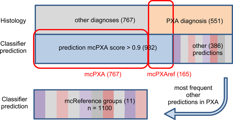 Figure 1: Graphical description of the study groups: Of 932 tumors receiving a classifier prediction (calibrated score >=0.9), 767 did not receive a histological PXA diagnosis and the latter were designated as mcPXA. 165 of the 932 also were diagnosed histologically as PXA (or PXA was in the differential diagnosis) and these were designated as mcPXAref. A control group containing 11 mc with 100 tumors each was selected based on the most frequent predictions in tumors histologically diagnosed as PXA but with other classifier predictions. The reference cohort included: mc Diffuse paediatric-type high grade glioma, RTK1 subtype, subclass A (mcpedHGG_RTK1A); mc Ganglioglioma (mcGG); mc Glioblastoma, IDH-wildtype, atypical mesenchymal type (mcGBM_MES_ATYP); mc Glioblastoma, IDH-wildtype, RTK1 subtype (mcGBM_RTK1); mc Glioblastoma, IDH-wildtype, RTK2 subtype (mcGBM_RTK2); mc Glioblastoma, IDH-wildtype, typical mesenchymal type (mcGBM_MES_TYP); mc High-grade astrocytoma with piloid features (mcHGAP); mc Infant-type hemispheric glioma (mcIHG); mc Infratentorial pilocytic astrocytoma (mcPA_INF); mc Neuroepithelial tumour with PATZ1 fusion (mcNET_PATZ1) and mc Supratentorial pilocytic astrocytoma (mcPA_CORT). Determination of CNV and summary CNV plots tSNE analyses were performed using the R-Package Rtsne (https://github.com/jkrijthe/Rtsne) employing the 20,000 most variable CpG sites according to standard deviation; 3000 iterations and a perplexity value of 10. CNV data were calculated from the output of the Illumina 450K or 850K/EPIC platforms. CNV plots are based on the raw data subjected to analysis by the ‘conumee’ R package in Bioconductor (https://www.bioconductor.org/packages/release/bioc/html/conumee.html). Assessment of copy-number alterations was automated using the results from conumee after additional baseline correction. Amplifications were called if the respective probes exhibited a value higher than 0,55 on a log2-scale. Homozygous deletions were called if the respective probes exhibited a value lower than -0.4 on a log2-scale. Statistics All data sets were collected retrospectively. Distribution of nominal data was tested employing Fisher’s exact test. Results Diagnoses in mcPXA Tumors with a mcPXA prediction but without a PXA diagnosis (n=767) received another diagnosis in 399 instances. No diagnosis was provided for 368 cases. Diagnoses were slightly simplified to allow for categorization. A list of given diagnoses is provided in supplementary table 2. tSNE of mc PXA, mcPXAref, and reference sets Using t-distributed stochastic neighbor embedding (t-SNE) we analyzed all tumors of the study cohort and reference sets (Figure 2). Tumors receiving the classifier prediction mcPXA were annotated according to presence (mcPXAref) or absence (mcPXA) of the histological diagnosis (or differential diagnosis) of PXA. Importantly, the distribution within mcPXA and mcPXAref is similar. This demonstrates that the morphological features defining histological PXA cannot readily single out a subpopulation within mcPXA associated with ‘canonical’ features.