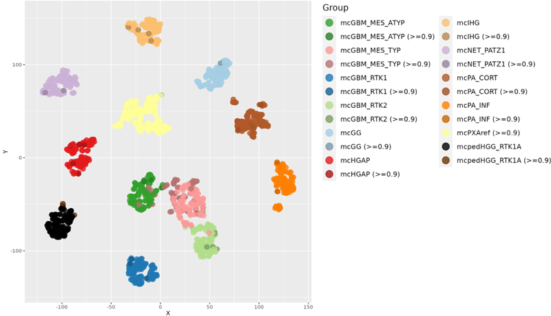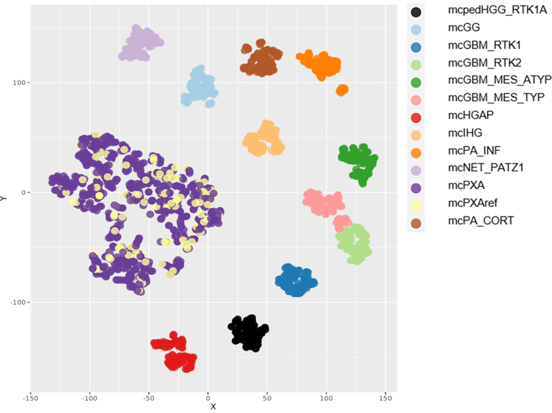 Figure 2: tSNE analysis of mcPXA, mcPXAref and reference sets. Tumors from the mcPXA and the mcPXAref cohorts cluster together and are separated from the reference sets. Summary CNV (sumCNV) plots of mcPXA, mcPXAref and reference sets For an overview, summary CNV (sumCNV) plots were generated for all cohorts. Tumors with the classifier prediction PXA were divided in two subgroups, depending on whether the histological (differential) diagnosis was PXA (mcPXAref, n=165) or another histological diagnosis or no diagnosis was given (mcPXA, n=767). SumCNV plots of mcPXAref and mcPXA were virtually identical, indicating that the presence or absence of the histological diagnosis PXA does not associate with the frequency of any CNV (Figure 3). The sumCNV profiles of the 11 reference sets of differential diagnoses were clearly distinct from the mcPXA and mcPXAref sumCNV profiles. Notable differences can be observed between the 4 glioblastoma IDH wildtype subgroups containing 100 samples each. Most evident was the highest proportion of the 7/10 signature and an increased incidence of trisomies of chromosomes 19 and 20 in GBM IDH wildtype RTK2. These differences will be followed up in larger cohorts. Summary CNV profiles are provided in Figure 3.