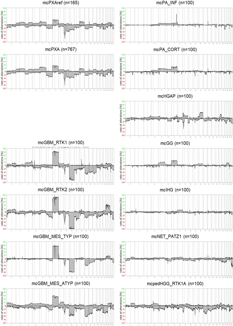 Figure 3: Summary CNV plots of mcPXA, mcPXAref and reference sets. Prevalence of the 7/10 signature in mcPXA, mcPXAref and reference sets Combined gain of chromosome 7 and loss of chromosome 10, dubbed 7/10 signature, is a very frequent molecular feature of glioblastoma. The best parameters for defining the 7/10 signature have not yet been established. In this study, a previously published algorithm has been employed (9). Presence of the 7/10 signature was scored if gain of at least 50% of the short or the long arm of chromosome 7 coincided with loss of at least 50% of the short or the long arm of chromosome 10. The 7/10 signature according to this guideline was not observed at all in Infant-type hemispheric glioma. Supratentorial pilocytic astrocytoma and Ganglioglioma typically exhibiting frequent gain of chromosome 7 (Figure 3) both presented with the 7/10 signature in 1% and 2% of the cases, respectively. Likewise, the 7/10 signature occurred in only 1% of Infratentorial pilocytic astrocytoma; however, this tumor group much more rarely exhibited chromosome 7 gains. Only 2% of Diffuse paediatric-type high grade glioma, RTK1 subtype, subclass A carried the 7/10 signature. Among the glioblastoma subtypes we detected a presumably nonrandom difference in the frequency of 7/10 signature ranging from 38% in mcGBMmes_atypical to 92% in GBM_RTK2. These differences will be followed up in a larger cohort of glioblastomas. Our study demonstrated the presence of the 7/10 signature in 24/165 (15%) mcPXAref and in 145/767 (19%) mcPXA. The difference in frequencies of the 7/10 signature in both groups was not significant (Fisher’s exact test p >0.29). The distribution of numerical alterations on the chromosomal arms 7 and 10 in mcPXAref, mcPXA and the 11 control groups is shown in table 1. Data for 2418 individual tumors are provided in supplementary table 3.