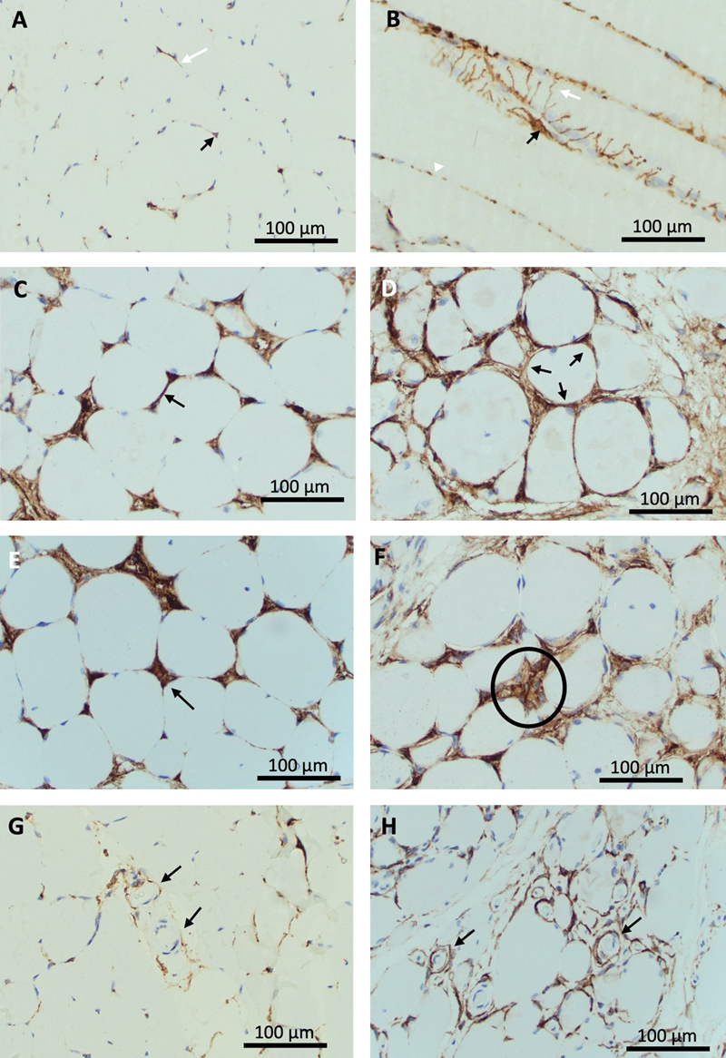 A-B: Normal muscle demonstrates occasional triangular staining cell bodies in endomysial corners (black arrow) and delicate linear staining processes along endomysial lines (white arrow) on cross section (A). Longitudinal sections (B) show plump cell bodies (black arrow) with processes extending around muscle fibers (white arrow). These appear as dot-like staining on deeper planes (white arrowhead).