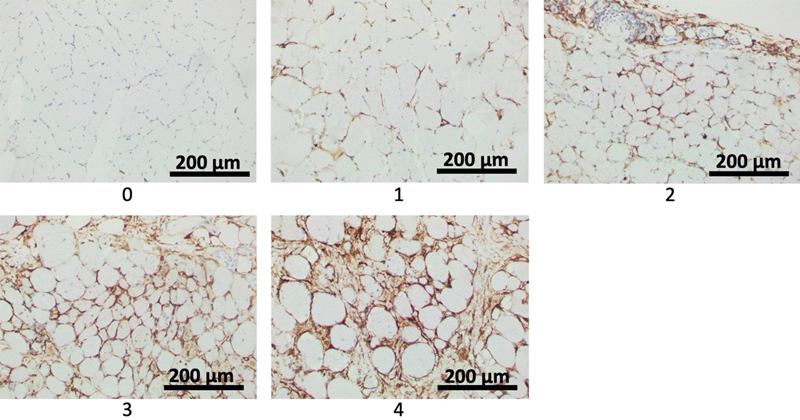 Figure 3. Exemplary photographs representing semiquantitative scores 1 to 4 of endomysial FAP process activation as defined in Table 2. With increasing severity, ropey processes are seen along increasing numbers of myofibers, eventually showing circumferential staining around a few and many fibers for scores 3 and 4, respectively.