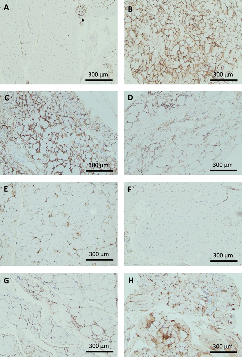 Figure 4. Exemplary patterns of CD10+ FAP activation across pathological groups. A: Normal muscle biopsy. Occasional triangular cell bodies in endomysial corners and granular staining along capillaries running transversely. There is in addition a cross section of peripheral nerve with CD10 immunoreactivity of perineurium and myelin sheaths (black arrowhead). Endomysial and periarteriolar CD10+ FAP activation across pathological groups Patterns of CD10+ FAP activation differed across disease groups. Typical photographs are presented in Fig. 4, scoring results are summarized in Fig. 5. Detailed correlation of scoring results, HE pathology, and distribution of CD10+ FAP activation is presented in table 3. Biopsies from the anti-synthetase syndrome group showed strong diffuse activation of FAPs with often circumferential processes and prominent FAP cell clusters. On HE stained sections, scattered or perifascicular de- and regenerating fibers were apparent, which demonstrated sarcoplasmic labelling on CD 10 immunohistochemistry. FAP activation was diffuse and as such included activation around normal appearing fibers as well as activation adjacent to degenerating and regenerating fibers (Fig. 4B). Dermatomyositis biopsies showed impressive diffuse circumferential ropey staining in regions of fiber atrophy but notably also in areas of fibers without evidence of de- or regeneration. In addition, there were clusters of cell proliferation, though less pronounced than in ASA-M biopsies. The cause of diffuse and pronounced FAP activation was not obvious on this study in the absence of evidence of fiber de- or regeneration, inflammatory infiltrates, or neurogenic change (Fig. 4C). IBM biopsies showed staining associated with inflammatory foci or regions of chronic myopathic change and fibrosis only, often with cell clusters. This could be interpreted as in keeping with a role of FAPs in fiber repair and fibrosis (Fig. 4D). Interestingly, IBM biopsies tended to show prominent periarteriolar staining, the significance of which is uncertain (Fig. 5B). Immune mediated necrotizing myopathies showed multifocal increased staining restricted to degenerating/regenerating fibers, with a mix of linear coarseness and expanded endomysial corners, consistent with fiber repair (Fig. 4E). Type 2 fiber atrophy did not show significant abnormal staining and has the same profile on scores as normal biopsies (Figs. 4F; 5A). In contrast, biopsies with neurogenic atrophy clearly exhibited increased ropey staining surrounding muscle fibers without evidence of FAP proliferation, as is also apparent on the scoring profile (Figs. 4G; 5A). Neurogenic biopsies showed in addition significant periarteriolar activation (Fig. 5B). Experimental evidence suggests a causal role of FAPs in neurogenic fiber atrophy. The absence of evidence of FAP proliferation raises the possibility that this effect may primarily go along with cell process expansion in human skeletal muscle. Biopsies from patients with rhabdomyolysis represent a histologically more diverse group with biopsies taken at various stages of degeneration or regeneration and with overall variable severity. These biopsies showed variable interstitial staining centered on abnormal fibers and frequent fibers with sarcoplasmic positivity in keeping with fiber regeneration (Fig. 4H).