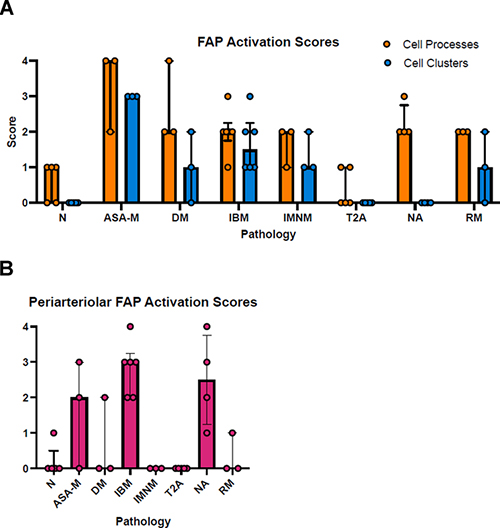 Figure 5. A: Endomysial FAP activation scores for cell processes and cell proliferation across pathological groups as defined in Table 2; median with interquartile range; circles represent individual cases.
