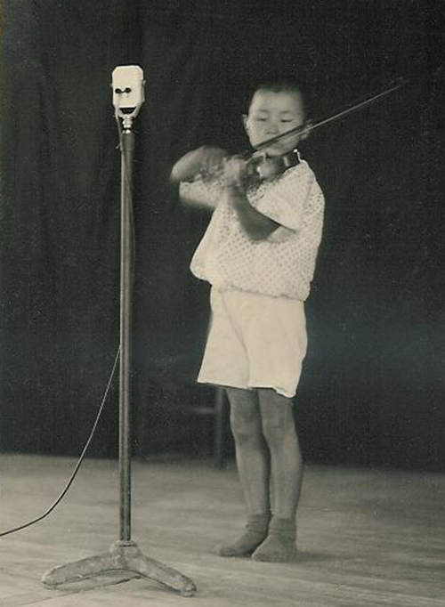 Fig. 1 Concert somewhere in Nagoya at the child music festival During my school age I began to learn painting and playing the violin (at 8 years?). Every weekend I visited a sketch group for children at the Nagoya Univ. School of Medicine (hobby painting clubs of medical staff and students) but I did not like, or even I hated, to sketch or paint – it was my joy only to play in the parks with friends and hobby-teachers. On the contrary, I liked music and learned intensively to play the violin by the Suzuki method (Fig. 1). Every week I had a lesson by a music teacher, a member of the Suzuki violin school. My father supported Mr. Shin’ichi Suzuki personally from the stand point of child psychiatry and I was given a lesson by Mr. Suzuki once per year at the Suzuki summer violin school and even an occasional remote personal lesson by sending/sending-back recoded tapes to Mr. Suzuki. I gave a "solo" concert at age 13/14 as an absolvent of the primary course: I played Mozart’s Violin Concert No.3 and others by Vivaldi, Haydn, Beethoven, etc., but not by J. S. Bach whose compositions I did not like. A few years later in the progressed course of the violin school, I lost my interests to play the violin but liked rather to listen to the music. I told my father that I would give up my violin lessons. He answered me "your teacher gave you the violin (technique) but could not give you music" and allowed me to give up my violin lessons. I liked small children and played with them when our family friends visited us (Fig. 2) though without music. Nevertheless, I had several occasions to play the violin in my later life: we constructed a flute quartet group with my medical classmates (1962), or I was occasionally a helping member of a small student orchestra (because of lacking musicians for concerts). However, I was not a regular member of the orchestra because I preferred playing football as a regular student member at that time. In my later life in Germany, I had a chance to play duet with a colleague whom I made acquaintance at a private home piano concert by Prof. Orthner in Goettingen (1990).