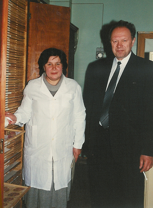 Fig. 6 Prof. Bogolepov, Director of the Brain Research Institute in Moscow, Russian Academy of Medicine and his sister Prof. Irina Bogolepova in front of the sample case in which the slides of Lenin’s brain are stored along with those of some other historical personalities. My bridge to Japan was, without my awareness, reconstructed and became so fine as a rainbow. I could often visit Japan and see not only old and new friends or colleagues there, but also I met European fellows, sometimes as my co-visitors or as a host in Japan (Fig. 7, 8): Prof. K. Jellinger, Prof. P. Kleihues, M. Lammens, G. Stoltenburg-Didinger, S. Weis and many others (Kyoto), later Manfred Oehmichen (at Osaka), Werner Paulus (at Tokyo), Ralf Schober (at Takamatsu), Markus Tolnay (at Nagoya/Toyohashi), Herbert Budka (at Tokyo), Torsten Pietsch (at Tokyo), Alexander Stan (at Tottori/Tokyo), Almuth Brandis (at Toyohashi), Ingmar Bluemcke (at Toyohashi) as well as already mentioned Hans ten Donkelaar and many others. It was my great honor not only to have met and spoken but also communicated with Prof. Asao Hirano (Montefiore) (Fig. 9) as well as Prof. Kinuko Suzuki (North Carolina, lastly Tokyo). I was visited by several high officers from the Ministry of Welfare and Labor of the Japanese Government (our enemy during my postgraduate time!).