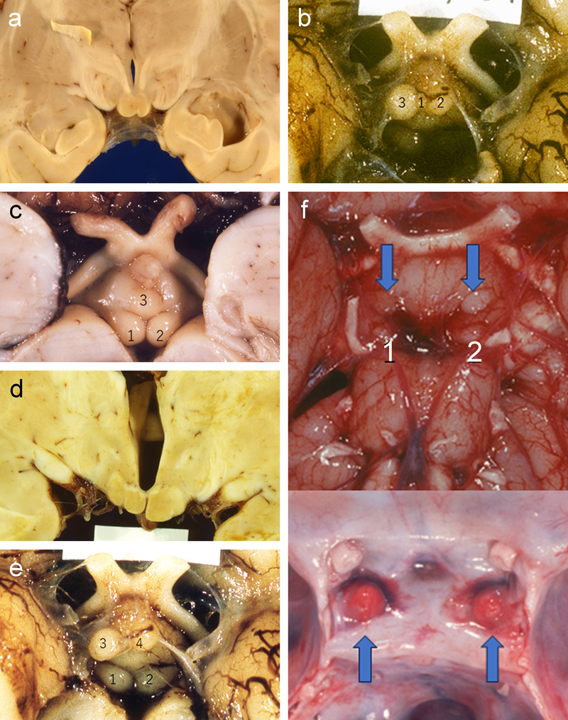 Fig. 10 From my hobby collections: different features of mamillary bodies in human brain. a: Unimamillaria? Fusion of mamillary bodies (the first report by Dr. Pittella in 1985). b: Trimamillaria or quintimamillaria? No! Numbers indicate three pieces of ganglionic hamartoma. Ordinary mamillary bodies are seen in the shadow, posterior to hamartomas. c: Again trimamillaria? No! 3 is "eminentia grisea" (tuber cinereum) of the hypothalamus, a normal anatomical structure. The pituitary stalk is seen near chiasma opticum. d: Quadrimamillaria? Morphometric studies showed insignificant difference in neuron cell count both in the lateral and medial subnuclei of the corpora mamillaria between this case and control cases; the size of neurons in this case was larger than that of control cases, but statistically insignificant, so that this case remained unreported. e: Again quadrimamillaria? 1 and 2 are regular mamillary bodies, 3 and 4 are ganglionic hamartomas. (Acta Neuropathol 56, 1982). f: Diastematomamillaria? Mamillary bodies separated from each other and not side-by-side (1, 2) in a case of median cleft face syndrome with double pituitary. (Acta Neuropathol 59, 1983) Arrows in upper and lower pictures indicate double pituitary stalk and double pituitary glands, respectively.