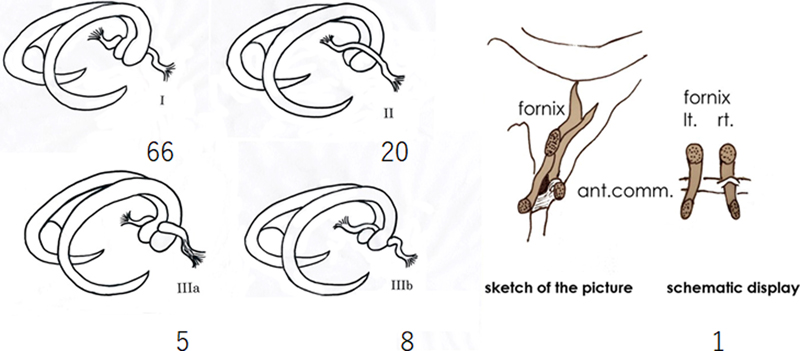 Fig. 11 Another example from my hobby collection: anatomic variants of fiber crossing of the anterior commissure in relation to the fornix. Of 100 examined adult brains, 66 showed type I, 20 type II, 13 type IIIa+b, and the last one showed a unique loop formation. According to a personal MRI, examined in 2013, my own anterior commissure showed a type I course. Prof. C. Hartmann, chief of the Division of Neuropathology at Hannover Medical School, allows me to visit his lab regularly. He kindly accepts my hobby NP, which remains so in my life further in Germany, while still keeping my Japanese nationality. My old colleague Prof. Uros Roessman from Cleveland, emigrated from former Yugoslavia to Austria and finally to the US, once answered my question, what home is: "Home is where you are now and feel at home." Copyright: © 2024 The author(s). This is an open access article distributed under the terms of the Creative Commons Attribution 4.0 International License (https://creativecommons.org/licenses/by/4.0/), which permits unrestricted use, distribution, and reproduction in any medium, provided the original author and source are credited, a link to the Creative Commons license is provided, and any changes are indicated. The Creative Commons Public Domain Dedication waiver (https://creativecommons.org/publicdomain/zero/1.0/) applies to the data made available in this article, unless otherwise stated. |
