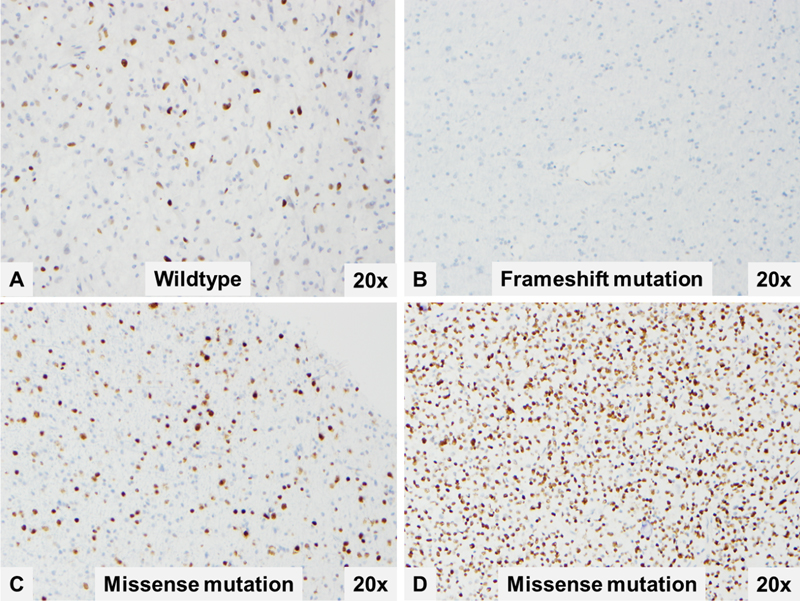 Figure 1. Representative p53 immunostaining patterns that were molecularly confirmed as TP53 wildtype (A), TP53 frameshift mutation (B) and TP53 missense mutations (C and D). Our study group was composed of 99 patients with an average age of 44.5 years (range 1-81 years). There were 49 female and 50 male patients. Tumor types and locations are presented in Table 1. Seventy-six (76) of the samples were from primary tumors (first resection) while 23 were from recurrent tumors. Two glioblastomas had earlier biopsies at another hospital without additional treatment before the patient was transferred to our institution. Seventy-two (72) of the primary tumors were CNS WHO grade 4, six were CNS WHO grade 3, and twenty-one tumors were CNS WHO grade 2. There were 52 TP53-mutant and 47 TP53-wildtype tumors and the distribution of these mutations among tumor types is presented in Table 1. Forty-two (42) tumors had missense mutations, while three others had missense combined with frameshift mutations. There were 3 tumors with frameshift mutation-only (Figure 2B). Table 1. Demographics, location of tumor, and final diagnosis