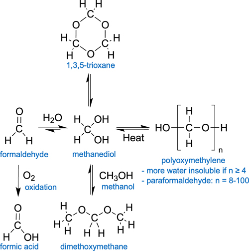 Figure 2. Schematic diagram of chemical alterations of formaldehyde in aqueous solutions. Paraformaldehyde is a commercial storage form of polyoxymethylene, with a mixture of polymerization products with degrees of 8-100 formaldehyde units (Walker, 1944). It is thought to be the monomeric form that is reactive and crosslinks biomolecules. As a result, the polyoxymethylene polymers in paraformaldehyde must be depolymerized prior to use as a fixative. This usually involves heating and the addition of sodium hydroxide to increase the pH of the solution and stimulate cleavage of formaldehyde units. When longer polyoxymethylene polymers form in aqueous solutions of formaldehyde, which is more likely to occur during storage at low temperatures, they can become insoluble and precipitate out of the solution. Methanol is often added to formaldehyde as a stabilizer. For example, the commercial product formalin often contains 37 % formaldehyde by weight and approximately 10 % of methanol. Methanol is believed to prevent polymer precipitation in formaldehyde solutions through the reaction of the alcohol group in methanol with the aldehyde group in formaldehyde, leading to the formation of hemiacetals or acetals such as dimethoxymethane (Norris et al., 2010; Walker, 1944). These hemiacetals interfere with the polymerization process of methanediol, thereby stabilizing them in solution and preventing the formation and precipitation of solid polymers. Notably, other chemicals that also contain an alcohol group, such as ethanol, glycols, and glycerol, can also stabilize formaldehyde and limit the extent of its polymerization. The reason that methanol is most commonly used as a stabilizer appears to be partially a historical consequence of the fact that formaldehyde was manufactured from methanol (Walker, 1944). A complicating factor is that methanol itself acts a fixative and may also contribute to tissue decomposition over time, especially of lipids. Some investigators use depolymerized paraformaldehyde that lacks any methanol. The practical effect of the methanol stabilizer in fixation and long-term storage of biospecimens is not well established. Formic acid In addition to polymerization, formaldehyde solutions stored at room temperature can undergo several chemical other reactions, leading to the formation of methanol, hydroxyaldehydes, sugars, and formic acid (Walker, 1944). For our purposes, the most important chemical reaction is thought to be the formation of formic acid. This can occur through two pathways. First, formaldehyde can be oxidized via oxygen in the solution to formic acid. Second, even if substantial oxygen is not present, the Cannizzaro reaction can occur, which is a disproportionation reaction wherein one molecule of formaldehyde is oxidized to formic acid, and another is reduced to methanol. Formic acid formation is a problem for brains stored in formaldehyde solutions over the long-term for several reasons. First, formic acid has the potential to solubilize proteins, especially hydrophobic ones, such as those found in myelin (Zheng and Doucette, 2016). Second, formic acid can also induce chemical modifications to proteins, which limits the use of formic acid in proteomics (Zheng and Doucette, 2016). As an example of this, formic acid has been found to destroy prion proteins in a way that formaldehyde itself does not (Taylor et al., 1997). Although formic acid may not adversely affect histology after short exposure times of one hour, its long-term effects on brain tissue preservation are still a concern (Brown et al., 1990). One source notes that the long-term storage of biospecimens in formaldehyde is corrosive because it breaks down into formic acid (Eichhorn et al., 2018). One study used a novel formulation of formaldehyde that removed formic acid with an ion-exchange basic resin, which they described as acid-deprived formaldehyde (Berrino et al., 2022). In this study, after six months of storage, they reported significantly less DNA fragmentation in the samples stored in formic acid-deprived formaldehyde compared to standard formaldehyde solutions. Notably, RNA was stable over the six-month period tested when stored in either solution. pH buffering In addition to directly damaging tissue, the formation of formic acid over time will also lower the pH of a solution containing formaldehyde. In turn, lower pH can damage tissue by causing or accelerating protein denaturation, protein aggregation, and the hydrolysis of biomolecules. As a result, it is commonly thought that more acidic conditions are associated with worse tissue degradation (van Duijn et al., 2011). To prevent acidification of formaldehyde solutions, a neutral buffer is often used, which is often in the form of a phosphate buffer. A pH buffer system involves the use of weak acids and their corresponding conjugate bases, or vice versa. In the case of phosphate buffer, monohydrogen phosphate, [PO3(OH)]2-, acts as the conjugate acid and dihydrogen phosphate, [H2PO4]-, acts as the conjugate base. These ions form a buffer system that can slow changes in pH. Formalin with a phosphate buffer added is called neutral buffered formalin (NBF). Unbuffered formalin has a pH of approximately 3.7, while that of buffered formalin can be tuned, usually to a pH of approximately 7.0 (Nuovo and Richart, 1989). Historically, NBF was not widely used, but it has been more commonly used in the past several decades. NBF is expected to lead to less tissue damage during storage by preventing a drop in pH as the formaldehyde-preserved solution forms acids. However, the capacity of the buffer system will eventually be reached, and with additional acid formation, the pH will decrease regardless of the initial buffer. Multiple empirical studies have examined the acidification of formalin solutions, both buffered and unbuffered, in the preservation of human brains. These studies have found that the pH of brain tissue fixed with buffered formalin te