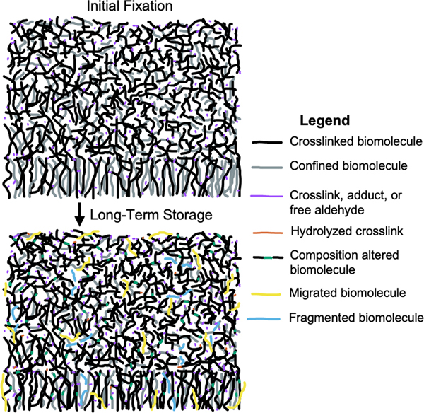 Figure 5. Conceptual diagram of the dynamic changes in biomolecules during long-term storage in fixative. Effects of formaldehyde storage on tissue morphology The most severe storage artifact we identified was in van Duijn et al. 2011, who reported numerous areas of white discoloration on gross examination and corresponding hypointensities on MRI (van Duijn et al., 2011). No such areas were identified in brains stored in formalin for up to 1 year, but all brains stored over 6 years showed them, with increasing frequency with longer storage. These areas are on the order of hundreds of micrometers in size. On light microscopy, they contain granular, basophilic neuropil changes with some tissue rarefaction, and decreased Kluver's staining, thereby indicating a lower density of myelin. The authors noted that cells and vessels are unaltered in these areas. On electron microscopy, these areas contain spaces with absent or minimal neuropil, and varying amounts of lamellar structures, interpreted as membrane remnants and/or degenerated myelin sheaths. Notably, the brains in this study were stored in sealed plastic bags with a small excess of 10 % formalin, as opposed to the more common method of storage immersed in fluid in a glass or plastic container. The storage artifacts identified in van Duijn et al. 2011 were found throughout the cortex, and should be detectable by many other studies, including as white discolorations on gross examination, hypointensities on MRI, areas with basophilic neuropil on light microscopy, and localized empty spaces on electron microscopy. However, other studies did not report these artifacts, including other electron microscopy studies (Dykstra, 2010; Liu and Schumann, 2014; Tsutsumi, 2018), and studies that could account for sampling bias by using neuroimaging (Herbin et al., 2021; Wiggermann et al., 2023). As an additional test, we grossly examined several brain samples stored via fluid preservation in the Neuropathology Brain Bank at Mount Sinai for between 3-5 years and we did not identify any white discolorations (Figure 6). Taken together, we suggest that the neuropil decomposition this study found during storage may be associated with the plastic bag storage method that likely leads to more air exposure, while also pointing out that this is a critical area for further research.