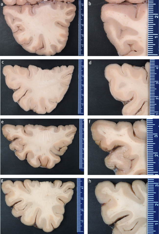 Figure 6. Gross examination of postmortem human brain tissue reveals an absence of macroscopic discolorations in the cortex. One study found that storing rat brain tissue in 2 % paraformaldehyde and 2.5 % glutaraldehyde buffered by sodium cacodylate for 1 month led to more frequent intracellular and extracellular “myelin-like” whorls on electron microscopy than were seen after 3 hours of fixation (Robards and Wilson, 1993). By 12 months, the whorls appeared less membranous and were associated with areas of lucency, suggestive of lipid leaching. The authors suggest that this artifact may be due to incomplete fixation of phospholipids, causing them to dissolve, coalesce, and then take on this myelin-like appearance after reacting with osmium tetroxide. They note that the preservation of cellular organelles was stable with long-term storage and that the length of fixation is thought to be less critical for morphology than other variables like the fixative used, the buffer, the pH, and the osmolarity. Another study found that similar myelin-like whorls were more common inside and outside of cells in skin tissue on electron microscopy after storage for 4 weeks in 2.5 % glutaraldehyde (Lindberg, 1984). Myelin-like figures have also been associated with mitochondrial degeneration (Le Beux et al., 1969). It has been speculated that they result from the reaction of extracted phospholipids with osmium tetroxide (Ericsson et al., 1965). Unless they become severe, the myelin-like whorl artifacts seem to be small enough that they would be unlikely to substantially affect the mapping of neural circuitry. In addition to these morphological artifacts, there are several others to consider. One study notes that nuclei degrade in brain tissue stored in formalin and that this progressively worsens from 15 to 80 years of storage (Cook et al., 2014). The authors suggest that for the samples fixed for a longer period, different formulations of formalin may have been used, such as a non-buffered version. In contrast, other studies did not describe a loss of nuclei even after many decades of storage in formaldehyde (Sheaffer et al., 1999; Herbin et al., 2021). Several studies note that silver staining can be altered following extended formalin fixation (Wilcock et al., 1990; Heinsen et al., 2000; Rosoklija et al., 2003). However, this appears to be dependent on the method of silver staining. For example, one study notes that the rapid Golgi method gave inadequate results, while the Golgi–Kopsch method yielded excellent quality staining comparable to tissue fixed for a few years, even on tissue stored in formalin for up to 55 years (Rosoklija et al., 2003). One study that used cresyl violet staining to visualize neuronal morphology reported that “structural preservation” was not as good in tissue fixed in formalin for many years, without providing more detail on what aspect of the structure was altered (Lai et al., 2018). As in immunostaining studies, overfixation might help to account for decreased morphologic staining intensity after prolonged fixation. Because morphological stains non-specifically bind to many types of biomolecules, if there is a global decrease in biomolecular binding capacity due to excessive crosslinks, then this will lead to a global decrease in the signal to noise ratio of morphological staining. Some biomolecules may also be extracted from cells over time, making the cytoplasm of cells appear more pale (Lindberg, 1984; Robards and Wilson, 1993). Additionally, because long-term fixation can render tissues more acidic, the staining quality of anionic dyes may be especially decreased (Puchtler and Meloan, 1985). In addition to histologic effects, long-term storage in fixative can also have macroscopic and biomechanical effects. Upon initial fixation, fixatives often cause cell shrinkage, which is accentuated for stronger fixatives such as glutaraldehyde (Nei, 1981). One source finds that after the initial fixation, the volume of canine brain structures was not altered due to additional storage in formalin for up to 12 months (Del Signore et al., 2022). On the other hand, other reports have suggested that specimens do have secondary shrinkage if they are stored in fixative fluids for long periods (Bahr et al., 1957; Heinsen et al., 2000). This discrepancy may be due to the type of brain tissue, the fluid properties, and the duration of storage. Macroscopic shrinkage may correspond to widespread microscopic strengthening of chemical gels in the tissue over time. Strengthening of microscopic interactions, however, is associated with changes in the material properties of the brain, insofar as it becomes more stiff, brittle, and difficult to section (Dannhorn et al., 2022). Prolonged storage in fixative can also promote the accumulation of formalin pigment (Sacchini et al., 2022). Formaldehyde formulation The concentration and formulation of formaldehyde may play an important role in long-term storage. Several studies have used a lower concentration of formaldehyde for storage, such as 0.1 % paraformaldehyde (Lyck et al., 2008), 1 % formalin (Papageorgopoulou et al., 2010; Wiggermann et al., 2023), 2 % paraformaldehyde (Wu et al., 2002), or 2 % formalin (Monteiro, 2008). Using a lower concentration of formaldehyde during storage is appealing because it may help to prevent the negative effects of formaldehyde while still preventing microbial growth and any theoretical loss of morphologic cohesion. In terms of additives, there is a concern that storage in commercial formalin solutions, which contain a small amount of methanol in addition to formaldehyde, may lead to lipid damage, because methanol is a solvent for lipids (Öztürk and Koç, 2022). However, one study found that even after 18 years of storage in methanol-stabilized formaldehyde, staining with a lipophilic dye was still possible, and that there was no difference in the distance of nerve tracing possible as a result of storag