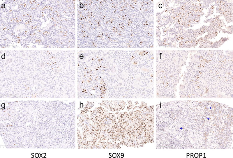 Figure 1: Two gonadotroph tumours (upper and middle row) demonstrating immunolabeling for SOX2, SOX9 and PROP1 with score 4 (a, b), score 5 (c) and score 2 (d-f). A silent corticotroph tumour (bottom row) demonstrating immunolabeling for SOX2, SOX9 and PROP1 with score 1 (g), score 5 (h) and score 1 (i). PROP1-positive cells in I are pointed with arrows to distinguish them from erythrocytes that show unspecific staining by PROP1 IHC analysis.