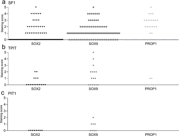 Introduction The pituitary gland is the main regulator of the endocrine systems, and has a complex development and maturation during life. The pituitary orchestrates growth, metabolism and reproduction in humans, and adapts to major physiological life changes such as puberty, pregnancy and menopause. The different cell lineages of the anterior pituitary lobe are derived from Rathke's pouch during embryogenesis [1]. Rathke's pouch contains stem cells and progenitor cells expressing transcription factors, e.g. SRY-Box Transcription Factor 2 (SOX2), SRY-Box Transcription Factor 9 (SOX9) and Prophet of PIT1 (PROP1) [2]. Single cell sequencing shows that SOX2, SOX9 and PROP1 are expressed in stem cell populations in the human fetal pituitary [3]. Adult stem cells have been identified in several tissues including the pituitary, and have the capability of self-renewal, and the ability to differentiate in specific cell types that are typically restricted to the tissue of origin [3, 4]. The pituitary adaptation to different life events might be facilitated by the presence of stem cells [5]. PROP1 is a transcription factor found in the early development of the pituitary gland and is known to be expressed in pituitary stem cells [3]. PROP1 is necessary for the development of the PIT1 and SF1 lineages. Moreover, PROP1 has a role in the migration of developing pituitary cells from Rathke's pouch in early pituitary development [6–8]. For simplicity, PROP1 will be addressed as a stem cell-associated marker throughout the manuscript together with SOX2 and SOX9. Pituitary neuroendocrine tumours (PitNETs) are common intracranial neoplasms of epithelial origin. They are classified immunohistochemically based on the staining for the different adenohypophysial hormones FSH, LH, ACTH, GH, Prolactin and TSH and the pituitary transcription factors SF1, TPIT and PIT1 [9]. Further, the tumours are clinically characterised by their functionality. Approximately half of the PitNETs are clinically non-functioning, lacking clinical features and symptoms related to hormone overproduction [10, 11]. The majority of non-functioning PitNETs (NF-PitNETs) are gonadotroph (SF1) in origin, followed by corticotroph (TPIT) and rarely by PIT1 cell lineage tumours [12, 13]. The NF-PitNETs are usually detected due to compression symptoms from the surrounding structures, mainly yielding symptoms from the visual apparatus or from hypopituitarism. However, an increasing number of tumours are detected incidentally by imaging procedures taken for unrelated reasons [14]. To date there is no medical treatment available for the NF-PitNETs. Tumour-directed treatment involves pituitary surgery. A substantial proportion of patients presents with postoperative tumour remnants that may grow, and there are no reliable markers differentiating the tumours needing adjuvant or repeated intervention. The tumourigenesis of PitNETs is poorly understood. Most tumours are sporadic, and only a small proportion is associated with gene mutations e.g. in AIP or MEN [15]. In a rat experimental pituitary tumour model, the level of SOX9 was decreased at the initial stage of tumourigenesis; however both SOX2 and SOX9 expression levels were similar to those observed in normal pituitary gland at a more advanced stage of tumourigenesis [16]. Cells with stem cell-like features have been found in histological specimens from human adenohypophysial tumours [17] and single cell mRNA-sequencing has shown clustering of pituitary stem cell markers in both normal and tumourous pituitary stem cells [18]. SOX2 has been found in approximately 20 % of human NF-PitNETs [19]. Furthermore, nuclear coexpression of PROP1 and SOX2 was found in tumour stem cells isolated from NF-PitNETs [20]. It has been hypothesised that pituitary stem cells play a role in the development of PitNETs by paracrine effects, while tumour models have shown that the stem cells themselves do not give rise to tumour cells [21, 22]. Yet there is still a substantial knowledge gap concerning the role of tumour stem cells at different stages of tumourigenesis. In this study, we characterised the presence of stem cell-associated transcription factors known to be present in the adult human pituitary in NF-PitNETs and correlated them to clinical and molecular markers. Methods Patients The study retrospectively included patients operated for clinical NF-PitNET between 1998 and 2009, where tumour tissue from primary pituitary surgery was available for immunohistochemical (IHC) subclassification (N = 158). All tumours were clinically classified as non-functioning at the time of surgery. Seventeen patients lacked tumour tissue available for IHC characterisation or frozen tumour tissue available for RT-qPCR (9 SF1, 4 null-cell, 3 TPIT and 1 PIT1 tumour), leaving 141 patients (129 tumour samples available for IHC analyses and 81 for qRT-PCR) for analysis of the stem cell-associated markers. Additionally four null-cell NF-PitNETs (not staining for anterior pituitary hormones or transcription factors) were excluded from the analyses due to lack of consistent IHC characterisation. All patients were operated at the same tertiary referral centre. Data from magnetic resonance imaging (MRI) were available for 60 patients (46 with gonadotroph, 9 with corticotroph and 5 with PIT1 tumours). Tumour volume was measured by the Cavalieri method, as previously described [23], and invasion was defined by the Knosp criteria. A tumour with a Knosp grade ≥ 3 on either side was defined as an invasive tumour [24, 25]. Repeated surgery or radiation therapy less than 12 months after primary surgery was defined as adjuvant treatment to the primary surgery. Hence, reintervention was defined as surgery or radiation therapy more than 12 months after primary surgery. Informed consent was obtained from all living patients. The regional ethics committee (REK 2014/635) and the hospital authority approved the study. Histopathology and Immunohistoch