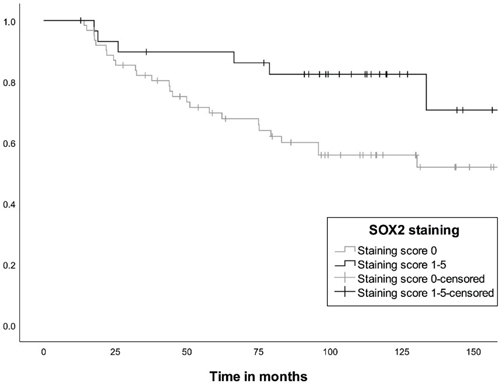 Figure 5: Kaplan-Meier curve showing the difference in reintervention rate between patients with gonadotroph tumours without SOX2 staining and tumours with SOX2 staining (p = 0.03). The number at risk at 25, 50, 100 and 150 months were 52, 40, 22 and eight, respectively, for the tumours not stained for SOX2, and 26, 24, 16 and three, respectively, for the tumours with SOX2 staining. Stem cell-associated markers and regulators of the gonadotroph axis For the gonadotroph NF-PitNETs, we found no difference in gender, age, tumour volume or invasiveness between tumours stained or not for the stem cell-associated markers SOX2, SOX9 or PROP1 (Suppl. Table 2). The staining for SOX2, SOX9 and PROP1 was associated with higher FSHβ but not LHβ gene expression and staining (Suppl. Table 2). SOX2-positive tumours showed higher levels of FSHβ and Estrogen Receptor α (ERα) staining as well as higher Estrogen Receptor 1 (ESR1) and GNRHR gene expression (Fig 6. a, c, d and Suppl. Table 2), whereas no difference was observed for LHβ (Fig 6 b). Similar patterns were observed for SOX9- and PROP1-positive tumours. No correlation was found between SOX2, SOX9, PROP1 and SF1 gene expression (Suppl. Table 2).