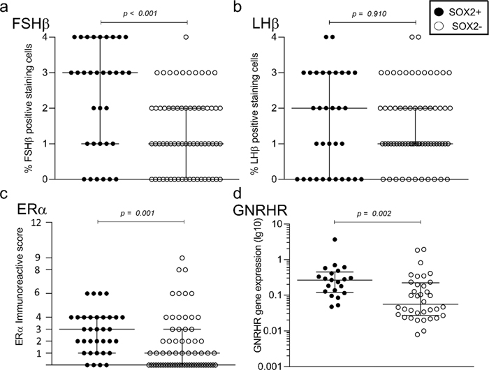 Figure 6: Expression of SOX2 and regulators of the gonadotroph axis. The presence of SOX2 was positively associated with higher levels of FSHβ, ERα and gene expression of GNRHR in the gonadotroph subgroup of NF-PitNETs (n = 101). SOX2 staining is classified as positive (staining score ≥ 1) or negative (staining score 0). Horizontal bars indicate median and interquartile values. Statistical comparisons are calculated by Mann-Whitney U test for all associations. Discussion The stem cell-associated markers SOX2, SOX9 and PROP1 were distinctly present, usually in a small proportion of cells, only in a subset of NF-PitNETs. The IHC staining and the gene expression levels correlated well for the same marker and between different markers. We did not find any association between the presence of the investigated markers, age at surgery, tumour volume or invasiveness. Absent SOX2 staining was associated with a higher rate of reintervention in the whole cohort of tumours and in the gonadotroph subgroup of tumours. The presence of the selected markers was positively associated with some of the regulators of the gonadotroph axis such as FSHβ, GNRHR and ERα in gonadotroph NF-PitNETs. In accordance with previous experimental studies [33–35], we demonstrate that cells with stem cell features are present at a low number in a subset of PitNETs. They tend to occur in small niches and have heterogeneous morphology corresponding to tumour cells and occasionally to endothelial cells. In the murine pituitary, SOX2-positive cells are present in a small proportion of cells (3–5 %) and usually scattered throughout the gland, and more concentrated lining the pituitary cleft [36]. A previous IHC study found SOX2 positivity in 20 % of human NF-PitNETs, which is not far from our results [19]. Interestingly, by using multiplex IHC, we demonstrate expression of the stem cell-associated markers SOX2 and SOX9 in intratumoural cells with epithelial features. However, in the cells positive for these markers, there was no immunolabeling for pituitary-specific transcription factors. It is not clear whether the cells coexpressing stem cell and epithelial markers may correspond to the previously described “follicular cells” of gonadotroph tumours, though these cells were found to express gonadotroph transcription factors in the study by Delfin et al [37]. Expression of stem cell-associated markers in a population of endothelial cells is in line with previous research, and may support speculation that transdifferentiation of stem cells into endothelial cells may contribute to tumour neovascularisation [33]. Moreover, SOX2 and SOX9 were strongly expressed in the epithelial cells of the Rathke's pouch remnants embedded in the tumour tissue, in accordance with previous studies demonstrating expression of stem cell markers in Rathke's pouch epithelium [18, 36] as well as in craniopharyngiomas originating from the epithelial remnants of Rathke's pouch [38]. The tumours lacking SOX2 staining presented a higher rate of reintervention in our cohort, contradictory to what we assumed initially. Surprisingly, Zhang et al found that the well differentiated SF1-tumours showed a higher rate of recurrence than the poorly differentiated tumours [18]. We have also previously presented data on markers associated with tumours being more differentiated and having a higher rate of reintervention in NF-PitNETs [30, 39]. The association between recurrence and differentiation in the SF1-tumours deviated from pituitary tumours of other cell lineages in the study from Zhang et al, corresponding to previous investigations in functioning pituitary tumours [40, 41]. Why the SF1-tumours deviate from the remaining pituitary tumours in this matter has not been explored. We found a moderate to strong correlation between the three markers SOX2, SOX9 and PROP1. Previous studies have shown that pituitary stem cells express both SOX2 and SOX9 [42], and cells with stem cell properties lining the borders of the marginal zone are also positive for PROP1 [1]. In our study, the presence of the stem cell-associated markers was consistently associated with markers of the gonadotroph cell phenotype. As previously described, stem cells lose SOX2 expression and generate committed progenitor cell lineages during embryonic development [43]. Recently it was hypothesised that SOX2-positive cells may give rise to a well organised structural and functional network that coordinates the responses to challenges, similar to the hormone secreting cells [5, 44]. Our data suggest that the SOX2-positive cell network is closely related to the gonadotroph cell network, or that both cell types respond to similar factors (e.g. nutrients, blood supply), and are located in similar areas in the parenchyma of the pituitary tumours. Whether the cells with stem cell features have a role in the hormonal regulation of the gonadotroph neoplastic cells, or whether the correlation presented here mirrors the normal pituitary phenotype is currently unknown. Limitations The study was of retrospective design, and tumour tissue was not available for all patients operated during the given time period, which may imply an inclusion bias. The IHC analyses were based on TMAs and not whole section slides. This might underestimate the presence of the markers investigated, knowing that stem cells or cells with stem cell features are few and might reside in niches in the tumour. However, the strong correlation between gene expression data and immunohistochemistry, as well as the high concordance between staining score in replicate TMA punches from the same tumour, as described in this study, supports the reliability of data acquired by TMA assessment. The expression of the proteins analysed by IHC was quantified based on different scales, i.e. ERα by immunoreactive score (IRS) and SOX2 by the percentage of distribution. This was due to a usually low number of positive cells and almost uniform strong s