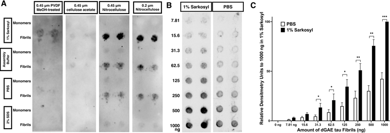 Figure 1. Optimal sensitivity in detecting dGAE tau fibrils is achieved using a 1 % sarkosyl solution in conjunction with a nitrocellulose membrane Using SDS-PAGE we found that the majority of dGAE tau aggregates were reduced to monomers when treated with Laemmli sample buffers containing SDS or lithium dodecyl phosphate (LDS), regardless of heat denaturation and reducing processes (Figure 2A). To corroborate our observations, we subjected protein samples, prepared in PBS, SDS, and sarkosyl, to native-gel PAGE followed by western blotting. Both the monomeric and fibrillar forms of tau dGAE protein, when in PBS, remained in the wells, presumably due to the high basic nature of tau dGAE, which has a theoretical isoelectric point of 9.59 and thus would be positively charged in the absence of an anionic surfactant10. When subjected to anionic detergents, the dGAE tau proteins displayed distinct behaviors: in SDS, the fibrils predominantly were broken down into monomers, whereas in sarkosyl, they retained their fibrillar integrity (Figure 2B).