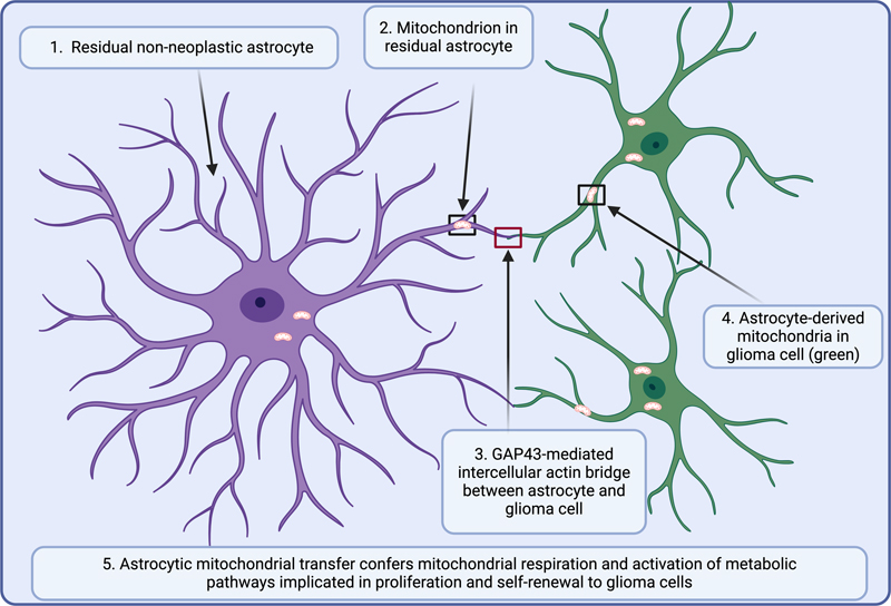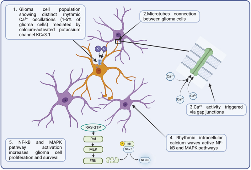 Figure 1: Rhythmic Ca2+ oscillation mechanism in glioma cell networks leading to enhanced malignancy via NF-kB and MAPK pathway activation. 2. GAP43-dependent transfer of mitochondria from astrocytes to glioma cells increases cellular proliferation and self-renewal [Watson et al., 2023]. It has previously been shown that brain cells interact via tunneling nanotubes (TNT), in neoplastic conditions also known as tumor microtubules (MTs), by which larger cellular organelles such as mitochondria can be transferred. In particular, glioblastoma cell-derived mitochondria can be shuttled into non-neoplastic astrocytes that subsequently adapted to tumor-like metabolism and hypoxia conditions [Valdebenito et al., 2021]. The study of Watson et al. analyzed the reverse, namely how mitochondria are transported from residual non-neoplastic astrocytes to glioma cells and how this impacted glioma cell function [Watson et al., 2023]. To elucidate this question, the authors used different mouse and rat glioma models with mitochondria and glioma cells fluorescing in different colors. By doing so, they could demonstrate that between 15 to 60 % of glioma cells incorporated mitochondria of non-neoplastic astrocytic, and to a lesser extent also microglial origin. It could further be shown that physical contact between non-neoplastic astrocytes and glioma cells is necessary for mitochondrial transfer. Inhibition of actin polymerization by cytochalasin B reduced the mitochondrial transfer rate, indicating an important role of actin cytoskeleton remodeling as an underlying mechanism. Hypothesizing that the actin-associated protein GAP43 that is involved in neurite outgrowth could be implicated in this mechanism, the authors knocked down GAP43 and observed significantly reduced mitochondrial transfer. Importantly, RNA sequencing showed an increase of gene activity related to electron transport and mitochondrial organization therefore suggesting a functional implication of mitochondrial transfer. This was corroborated by metabolic analyses showing a higher basal and maximal respiration rate in glioma cells having incorporated a higher number of astrocyte-derived mitochondria. This glioma fraction was also more aerobic and energetic as compared to their counterpart with lower mitochondria incorporation rate. In addition, amino acid and nucleotide metabolism were significantly altered in glioma cells with a higher transfer rate of mitochondria indicating a metabolic reprogramming that might be important for pro-proliferative, antioxidative and various cell signaling processes. The first evidence that this mechanism might play an important clinical role in neurooncology was observed in a mouse glioma model in which animals with glioma cells that incorporated astrocyte-derived mitochondria showed significantly shorter survival rates as compared to glioma cells without mitochondria transfer (summary of the proposed mechanism in Figure 2).