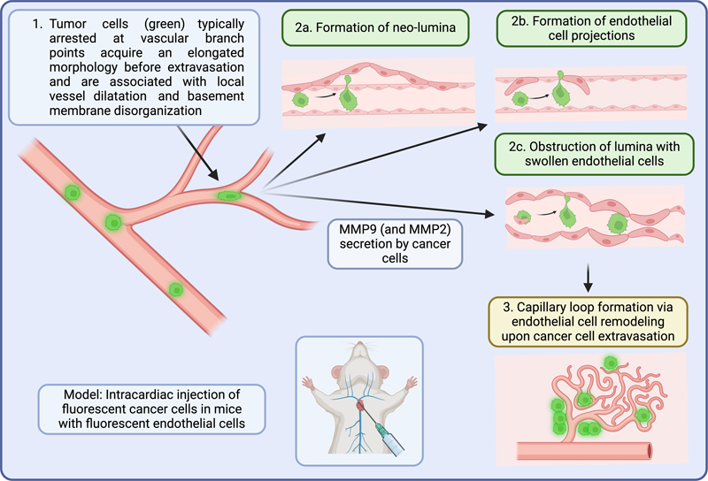 Figure 2: Mitochondrial transfer from residual non-neoplastic astrocytes to glioma cells thereby conferring respiratory and metabolic functions linked to glioma cell proliferation and tumorigenicity. 3. Brain endothelial cell remodeling by CNS metastatic cell-derived matrix-metalloprotease 9 (MMP9) as a mechanism for extravasation [Karreman et al., 2023]. Brain metastases still constitute the most frequent malignant CNS tumors, being much more frequent than their primary CNS tumor counterparts. There is a broad agreement on the key steps of cancer cell extravasation from the bloodstream to the CNS similarly to leukocyte extravasation including a) rolling/adhesion of cancer cells to brain endothelia, b) alteration of the blood-brain barrier (BBB) permeability and c) trans-endothelial migration, however, the exact underlying mechanisms are still not fully understood [Alsabbagh et al., 2023]. Previous observations, that primary cancer cells are able to considerably change the structure of brain vessels [Haskó et al., 2019], prompted the authors to decipher more precisely the potential underlying mechanism. By combining fluorescent and electron microscopy on murine brain metastasis models, the authors were able to trace the moment of interaction between cancer and endothelial cells and study those events at high resolution. The observed vascular arrest of cancer cells was mainly seen at vessel branch points where cancer cells acquired an elongated shape and surrounding vessels a significantly dilated state with disorganized basement membranes. Furthermore, the moment of extravasation could also be captured by showing tumor cell nuclei both partly inside and outside of brain capillaries with a nuclear diameter of less than 1 µm. The most prominent disruption of the basement membranes was observed during the extravasation process of cancer cells, without surpassing the astrocytic or microglial cell layers. Brain capillaries affected by cancer cell extravasation showed three major, reproducible findings, namely a) the formation of neo-lumina parallel to the pre-existing ones, b) formation of endothelial cell projections and c) obstruction of brain capillary lumina by swollen endothelial cells (Figure 3). Of note, those changes were reversible within 4 days if cancer cells left the respective blood vessel without performing extravasation. Furthermore, the faster cancer cells were able to extravasate, the more successful the survival rate of those cells was in the perivascular niche. Once cancer cells successfully extravasated and started perivascular metastatic growth, prominent endothelial cell remodeling led to the formation of capillary loops that followed the localization of tumor cells. The formation of capillary loops was even a prerequisite for the formation of macrometastases. This mechanism was mediated by cancer cell derived matrix metalloprotease 9 (MMP9). Pharmacological or genetic inhibition of MMP9 expression led to significantly reduced endothelial cell remodeling, extravasation of cancer cells, and the formation of metastases. These findings contribute to a better understanding of brain metastasis formation and may pave the way for new prevention or treatment strategies.
