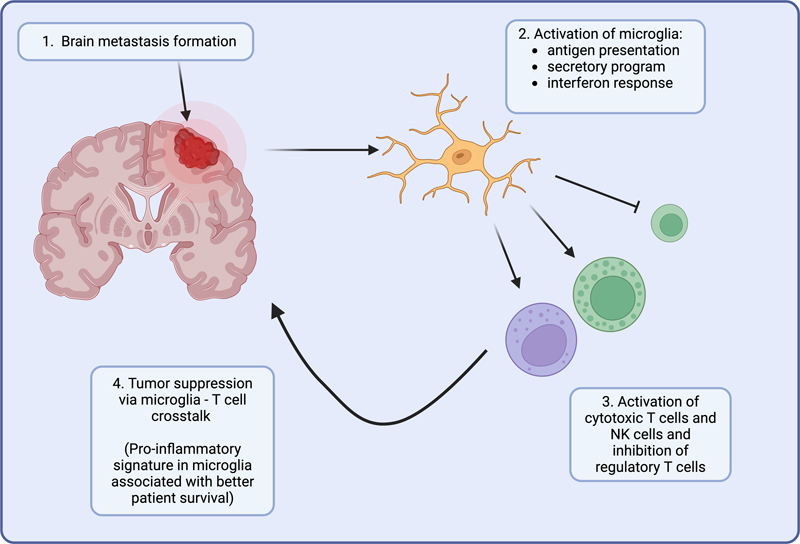 Figure 3: Alteration of brain endothelium upon interaction with MMP9 producing cancer cells. 4. Microglia suppress breast cancer brain metastasis formation [Evans et al., 2023]. Multiple studies have suggested a detrimental role of microglia in the development and/or progression of brain metastases [Izraely S et al., 2023; Pukrop et al., 2010]. To overcome the issue of distinguishing the contribution of primary cerebral microglia from secondarily invaded cells of the myeloid lineage (most importantly macrophages), the authors chose a complex study design including single cell RNA sequencing (scRNAseq) as well as genetic and humanized mouse models approaches [Evans et al., 2023]. In a murine breast carcinoma brain metastasis model in which intracardiac injection of tumor cells led to brain metastasis formation, scRNAseq revealed stable pro-inflammatory expression signatures related to cytokine production, antigen processing and presentation, and interferon-beta responses. As this signature was microglia-specific and only encountered upon brain metastasis formation, the authors hypothesized that these transcriptional changes were related to tumor cell sensing and pathological tissue alterations. An experimental depletion of microglial cells using a genetic model with deletion of a key super-enhancer in the Csf1r locus was associated with enhanced metastasis formation and reduced survival rates. Mechanistically, the authors showed that in the context of brain metastasis formation, microglial cells activate NK/NKT and CD8+ T cells, while attracting relatively less immunosuppressive T regulatory cells. Of note, experimental depletion of effector T cells led to reduced antigen presentation and IFN response in microglial cells, suggesting that only the orchestrated interaction between both cell types enables their full antitumoral capacity (Figure 4). The antitumoral responses were conserved in an additional experimental mouse model with human microglial cells. The authors reanalyzed data from an RNA sequencing study from human breast cancer brain metastasis patients [Varešlija et al., 2019]. In line with their findings and hypotheses, this patient cohort demonstrated significantly longer survival rates if breast cancer brain metastases were associated with a high expression of canonical microglial markers indicating a higher tumor infiltration by microglial cells. Although still many scientific papers stress a pro-tumorigenic role of microglial cells in primary and secondary brain tumors, the findings of the present study are also in line with some human tissue-based studies describing a beneficial contribution of microglial cells to prolonged patient survival in glioblastoma [Zeiner et al., 2019].
