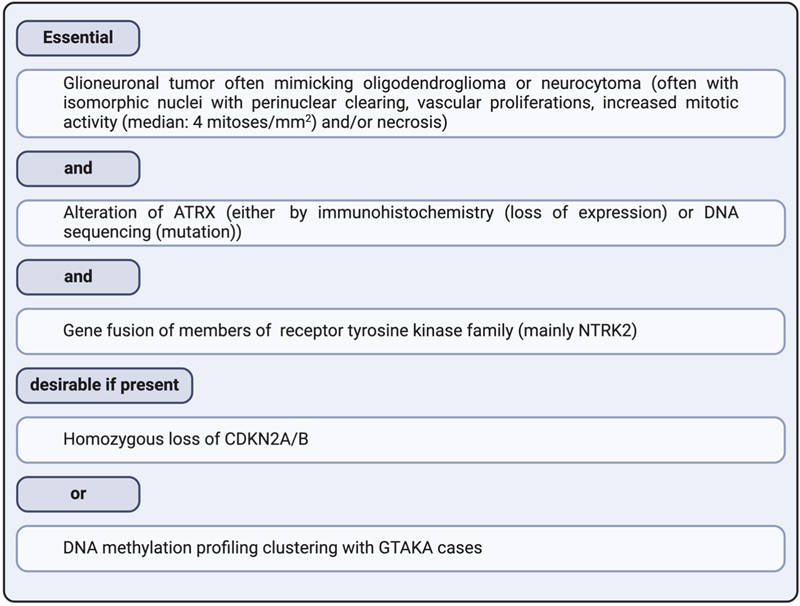 Table 1: Proposition of diagnostic criteria for Glioneuronal Tumor with ATRX alterations, Kinase fusion and Anaplastic features (“GTAKA”). 6. “De novo replication repair deficient glioblastoma, IDH wildtype”: a new glioblastoma subtype with implications for targeted treatment [Hadad et al., 2023]. Over decades, the treatment of glioblastoma patients consisted of neurosurgical resection followed by radio-chemotherapy and is, however, still associated with a detrimental prognosis. Despite a multitude of clinical studies, valid biomarkers for potential targeted therapies are largely lacking [Rodgers et al., 2024]. Therefore, it is highly important to define glioblastoma subtypes, even if they only occur at low percentages, that might benefit from new treatment approaches. In a recent larger series of 459 consecutive glioblastoma patients, 9 patients (2 %) with a biallelic inactivation of a canonical mismatch repair gene (MSH2, MSH6 or MLH1) were identified, partly with a heterozygous germline mutation (indicating an underlying Lynch syndrome) in a part of the glioblastoma patients [Hadad et al., 2023]. While overall mutation rate was significantly increased in this tumor group, they showed lower rates of classic genetic glioblastoma alterations such as trisomy of chromosome 7, monosomy of chromosome 10, TERT promoter mutation, EGFR amplification or homozygous CDKN2A deletion. In 3 out of those 9 patients, additional mutations in the proofreading domain of the DNA polymerase POLE were detected being associated with an ultrahypermutational state of more than 100 mutations per megabase. Of note, the mismatch repair deficient (MRD) glioblastomas presented as a giant cell variant of glioblastoma and DNA methylation profile either matched with “diffuse pediatric-type HGG, RTK1 subtype, subclass A”, “adult-type diffuse HGG, IDH-wt, subtype E” or did not match at all. Clinically, the median age at tumor occurrence was significantly lower (50 years) in the MRD group as compared to non-MRD glioblastoma patients (63 years). In addition, median overall survival was more than twice as long (36.8 months) in MRD glioblastoma as compared to non-MRD patients (15.5 months). Microscopically, MRD glioblastoma were associated with significantly more CD8+ cytotoxic T cells and microglia cells indicating a stronger immune activation in the context of a hypermutational state. As smaller studies demonstrated that some MRD glioblastoma patients radiologically and clinically profited from immune checkpoint inhibition treatment, the identification of such patients (Table 2) is important [Bouffet et al., 2016]. With this, a better clinical patient stratification regarding improved survival times and suitability for treatments with immune checkpoint inhibitors is possible.