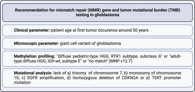 Table 2: Clinical and neuropathological parameters that should trigger MMR and TMB testing in patients with high-grade gliomas. 7. Ultra-fast, machine-learning based intraoperative methylation profiling [Vermeulen et al., 2023]. Methylation profiling considerably improved the unbiased and precise classification of brain tumors and was rapidly acknowledged as an essential criterium for diagnostics of most brain tumor entities by the WHO guidelines [Capper et al., 2018; WHO classification of brain tumors, 2021]. Most institutions performing methylation profiling still use an array-based approach for which the entire laboratory process before bioinformatic analyses takes approximately one week. However, for the intraoperative surgical guidance and potentially upcoming new treatment approaches with application of substances or cells directly in the tumor cavity, it might be important to have a precise, rapid on-site diagnosis. As brain tumors are more and more stratified according to molecular classes, an intraoperative histological assessment for primary cerebral neoplasms is of limited interest in many such cases. To overcome those obstacles, a fast genomic and epigenomic assessment using nanopore sequencing had been previously developed [Euskirchen et al., 2017]. The authors of the current study applied nanopore sequencing in combination with a neural network analysis (named “Sturgeon”) to molecularly classify CNS tumors intraoperatively [Vermeulen et al., 2023]. In 45 out of 50 samples, an accurate diagnosis was already obtained 40 min after initiation of the sequencing procedure in a retrospective cohort. After this highly promising proof of concept results, the authors were able to achieve intraoperative molecular diagnoses within a turnaround time of 90 min. A major advantage of the Sturgeon model is that it can be universally used without retraining (see https://github.com/marcpaga/sturgeon) on several different flow cell types (e.g. MinION or PromethION using R9 and R10 chemistry). However, the method is still strongly dependent on the tumor cell content. Therefore, a concomitant mirroring histological assessment of the tissue assessed by the Sturgeon model could be beneficial. 8. Multiomics neuropathology improving diagnostic precision, targeted therapy and detection of cancer predisposition syndromes in pediatric neurooncology [Sturm et al., 2023]. Over the past decade, diagnostic improvement in neuropathology was strongly linked to constantly improved methylome profiling [https:// www.molecularneuropathology.org/mnp based on Capper et al. 2018]. However, this approach has not yet contributed significantly to improved treatment approaches, partially due to a lack of related prognostic data or information about underlying genetic predisposition for tumor development that might be additionally important for further clinical follow-up [Farouk et al., 2021]. In their study, Sturm et al. combined methylation profiling with targeted panel sequencing in a cohort of more than 1,200 newly diagnosed pediatric brain tumors [Sturm et al., 2023]. With this approach, they were able to achieve a refined diagnosis in almost every second case as compared to current WHO classification alone. Moreover, in almost every second case, a potential therapeutically relevant alteration was detected and 15 % of all tumors revealed a directly druggable genetic alteration with BRAF-V600E being the most frequent (7.4 %), followed by FGFR1/3 (4.0 %), ALK (0.8 %), NTRK2/3 (0.4 %), MET (0.1 %) and RET (0.1 %). For 10 % of all cases an underlying cancer predisposition syndrome was found, amongst those, most frequently neurofibromatosis type 1 (1.5 %), followed by TP53-related Li-Fraumeni syndrome (1.2 %), constitutional mismatch repair gene deficiency or Lynch syndrome including MLH1, MSH2 and MSH6 genes (1.1 %), ataxia-telangiectasia and ATM heterozygous carriers (0.9 %), neurofibromatosis type 2 (0.8 %), DICER syndrome (0.6 %) and rhabdoid tumor predisposition syndrome 1 related to SMARCB1 (0.4 %) were observed. Compared to the initial cohort [Capper et al., 2018], 3 % of pediatric neurooncological cases in the present study belong to potentially new tumor classes. Of note, in up to one third of this pediatric patient cohort, discordant results were obtained when comparing standard WHO- and methylation-based analyses, particularly for the children histologically displaying tumors with characteristics of a high-grade glioma. Taken into account that clinical follow-up revealed that molecular profiling provides a better clinical prediction for patient prognosis than morphological assessment, it was highly recommended to implement multiomics neuropathological assessment in the diagnostic routine. The present study still highlights the importance of methylation profiling, as methylation data being discordant to the initial neuropathological diagnosis was considered as relevant in up to 70 % of the cases discussed in interdisciplinary tumor boards. A very useful tool of the study is the proposed molecular risk stratification of pediatric high-grade gliomas that have been classified according to CNS WHO grade 3–4 (Table 3). Although the WHO classification would put such tumors in a very similar biological class, it has to be taken into account that their clinical behavior might be very different and that multiomics, in particular methylation profiling, provides a much more precise prediction in those cases. Of note, the highly successful results of the present study further had a strong impact on health politics. German national health insurances now provide financing for DNA methylation profiling and gene panel sequencing (for the latter in both tumor and blood leukocyte samples) in parallel for every newly diagnosed brain tumor case in children and adolescents, thereby changing the standard-of-care.