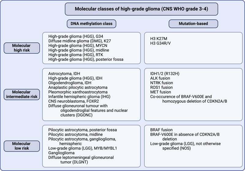 Table 3: Molecular risk stratification classes for of pediatric high-grade gliomas otherwise classified according to CNS WHO grade 3–4. The molecular risk remains unknown for cases revealing high score for non-neoplastic control tissue or being unclassifiable in the DNA methylation classifier. As the biological behavior is still unclear for pediatric brain tumor with PATZ1 or PLAGL1 fusion, those tumors were excluded from the risk stratification. 9. Clinical vaccination study targeting H3K27M in adult diffuse midline glioma [Grassl et al., 2023]. While mutations in histone H3 have been detected in several human tumors, the H3K27M mutation in diffuse gliomas of mainly younger patients constitutes a specific brain tumor entity usually showing a detrimental clinical prognosis [WHO classification of brain tumors, 2021]. Although, H3K27M mutant diffuse midline gliomas are incurable, the first promising results were obtained from MHC-humanized mice showing a mutation specific immune response to a H3K27M long peptide vaccine [Ochs et al., 2017]. This prompted the authors to start a phase I clinical trial with 8 patients suffering from a H3K27M-positive diffuse midline glioma [Grassl et al., 2023]. All patients received a 27-mer peptide (p14-40) including the mutant H3K27M via bi-weekly subcutaneous injection over 6 weeks followed by monthly administration for 4 months and quarterly afterwards until disease progression. The vaccine was well tolerated and without any relevant higher-grade side effects. After 2 injections, H3K27M-vaccine related neoepitope-specific immune responses (in blood and CSF) were detected in 5 out of 8 patients and were associated with promising neuroradiological findings showing reduced axial contrast enhancement. For patients from which previous tumor material was accessible, a colocalization of mutant H3K27M and HLA class-II-DR was detected, indicating that the neoepitope is probably presented by antigen-presenting cells which might lead to a stimulation of H3K27M-specific T cells. Of note, the two patients of this phase I study with the best clinical outcome after detection of peripheral immune response also showed highest numbers of HLA class-II-DR-positive cells associated with mutant H3K27M which may indicate that enhanced immune cell responses associated with mutant neoepitope presentation are responsible for better patient prognosis. With this first human vaccination trial for H3K27M mutant diffuse midline glioma, the authors demonstrated patient safety and neoepitope immune responses. As a most promising finding, complete remission for more than 31 months was achieved in one patient. However, all other patients died within the study period. To further improve the H3K27M vaccine-based effects, the authors propose to administer the vaccine concomitantly with first line treatment to increase the time for T cell mediated antitumoral effects. 10. Clinical study in patients with IDH mutant low-grade glioma using an oral, brain-penetrant inhibitor of mutant IDH1 and IDH2 enzymes [Mellinghoff et al., 2023]. In 2009, the detection of specific point mutations in IDH1 and IDH2 genes in distinct brain tumor entities, in particular diffuse astrocytoma and oligodendroglioma, considerably changed the neuropathological diagnostic approach paving the way from a mainly histological to a more and more molecular classification [Yan et al., 2009]. The most frequently altered amino acid is 132 in IDH1 and 172 in IDH2. Thus, those alterations make them a promising treatment target. The application of the dual IDH1 and IDH2 inhibitor Vorasidenib in an orthotopic murine glioma model showed considerably reduced 2-hydroxyglutarate levels that acts as an oncometabolite [Konteatis et al., 2020]. In addition, it was demonstrated that Vorasidenib also penetrated the brain of several non-human species therefore showing its CNS bioavailability in preclinical models. This prompted several neurooncological teams to test IDH1/IDH2 inhibitors in the clinical context of which the double-blind, phase 3 trial of Mellinghoff and colleagues is one of the most advanced studies for residual or recurrent CNS WHO grade 2 glioma comprising 331 patients in total [Mellinghoff et al., 2023]. The patients orally received Vorasidenib or placebo daily until disease progression or toxic treatment side effects occurred. Vorasidenib treatment was mainly associated with low-grade toxic side effects; however grade 3 or higher side effects were observed in 22.8 % of the patients in the Vorasidenib as compared to 13.5 % in the placebo control group. Of note, only 1.8 % of the patients treated with Vorasidenib showed serious side effects, therefore showing a clinically acceptable safety profile. The median progression-free survival was significantly improved upon Vorasidenib treatment, reaching 27.7 months compared to only 11.1 months in the placebo control group. Furthermore, time to next follow-up treatment was significantly longer in the Vorasidenib treated patients for which the median had not been reached by the time of publication of the study while the placebo group reached the median at 17.8 months. This study is another milestone on the way to more specific, efficacious and safe brain tumor treatments. The US Food and Drug Administration has now approved Vorasidenib as a systemic therapy for patients with Grade 2 astrocytoma or oligodendroglioma with a susceptible IDH1 or IDH2 mutation, based largely on the result of this study (see https://www.fda.gov/drugs/resources-information-approved-drugs/fda-approves-vorasidenib-grade-2-astrocytoma-or-oligodendroglioma-susceptible-idh1-or-idh2-mutation). Discussion In 2023, several novel pathogenic mechanisms were published that might serve as potential targets for oncological treatment approaches in the future. However, it still remains to be determined if those mechanisms can be targeted with high specificity without having negative side effects. For example, spontaneo