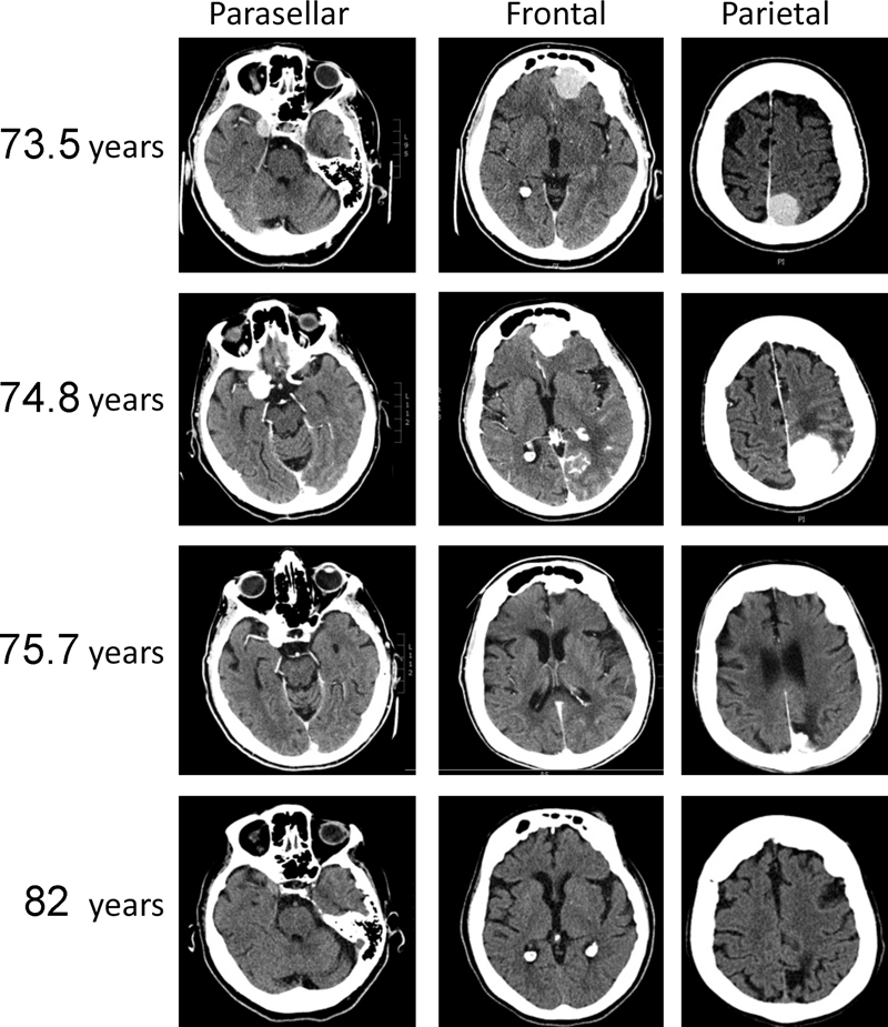 Figure 1. CT scans with contrast enhancement of brain showing dura-based tumors in the right parasellar, left frontal, and left parietal regions in a woman at ages 73.5 and 74.8 years when taking megestrol, and at ages 75.7 years and 82 years, after megestrol had been discontinued.