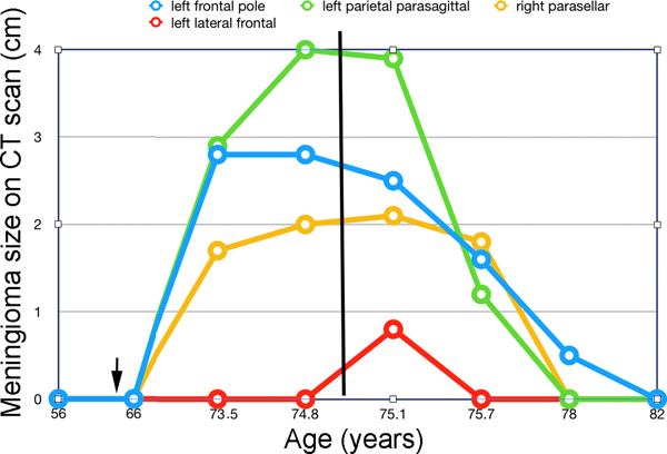 Figure 2. Line graph showing change in meningioma sizes on CT scans over time. Tumor size (in cm) is reported for the greatest dimension only. The arrow shows the time when megestrol was started and the vertical line shows the time when megestrol was discontinued. Complete autopsy was performed 3 days after death. The body was that of a thin female with no somatic evidence of malignancy, including in the pelvis at the site of the original endometrial sarcoma. Pathological findings The brain weight was 1137 g. The inner surface of the skull had extensive lobulated hyperostotic areas involving both frontal bones. Corresponding to the sites of the tumors identified on earlier CT scans, the dura mater along the skull base anterior to the left olfactory groove had a soft, yellow lesion (approximately 2 x 1 x < 0.3 cm) (Figure 3a). The dura mater in the right parasellar region was thickened and yellow. The internal surface of the paramedian left parietal convexity dura was focally thickened (approximately 3 x 2 x 0.5 cm) with adhesion to the brain (Figure 3b). The leptomeninges were unremarkable. Coronal slices through the cerebral hemispheres demonstrated minimal focal atrophy in the left frontal lobe tip and more pronounced atrophy with cavitation of the subcortical white matter in the left medial parietal region.