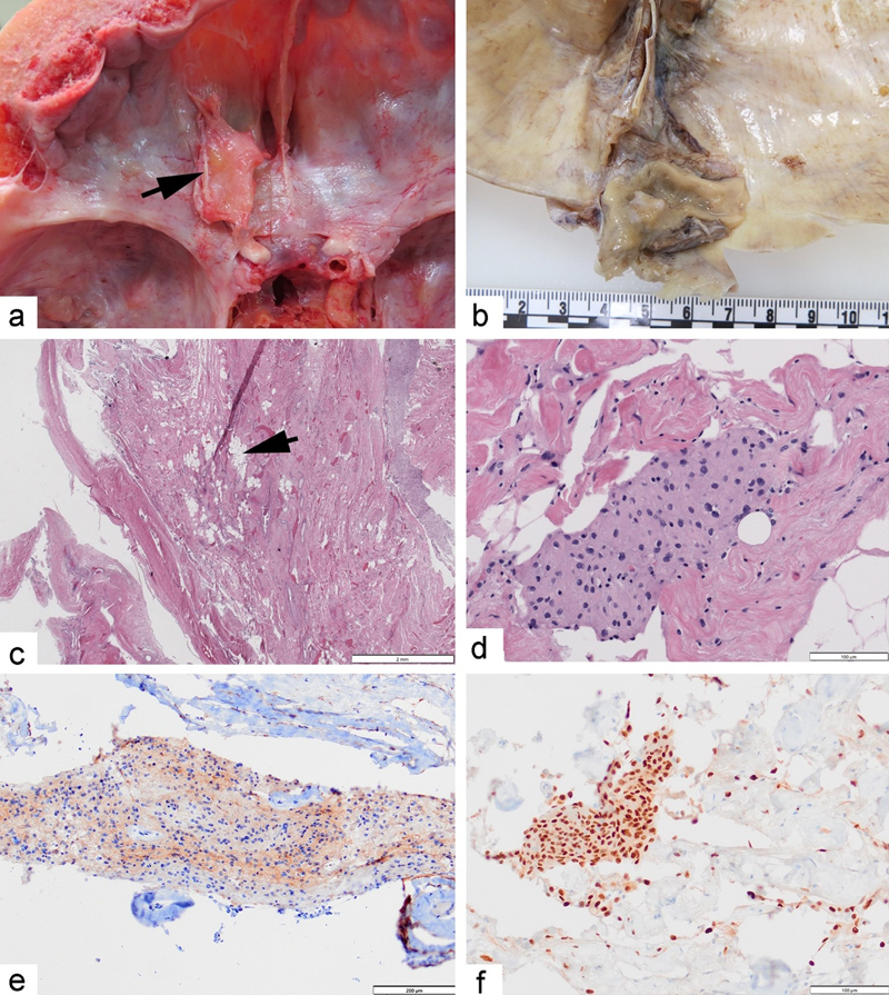 Figure 3. a) Photograph showing the anterior cranial fossa with left frontal bone hyperostosis and yellowish thick, firm tissue (arrow) reflected from the anterior falx cerebri at the time of autopsy. b) Photograph showing the thickened dura mater near the superior sagittal sinus in the left parietal region after formalin fixation. c) Photomicrograph showing the left parietal dura and fibrotic tumor with lipomatous meningioma (arrow). Hematoxylin & eosin stain, original magnification 12.5x. d) Photomicrograph showing a cluster of meningothelial cells in the left frontal tumor. H&E stain, original magnification 200x. e) Photomicrograph showing the residual left parietal tumor with immunoreactivity for epithelial membrane antigen (EMA) in brown with blue hematoxylin counterstain. Original magnification 100x. f) Photomicrograph showing the residual left frontal tumor with nuclear immunoreactivity for progesterone receptor (PR) in brown. Original magnification 200x. Microscopic features of the dura mater from the three identifiable previous tumor sites were all similar showing multiple small collections of meningothelial cells (Figure 3d), fibrovascular hyperplasia, and focal lipomatous meningioma (Figure 3c). The latter resembled adipose tissue and did not include meningothelial cells with foamy cytoplasm i.e. lipidized or xanthomatous change [16, 17]. Immunostains for epithelial membrane antigen (EMA) and progesterone receptor (PR) highlighted the meningothelial cell aggregates buried within the collagenous tissue (Figures 3e and 3f). Nuclei in the lipomatous component were predominantly negative for PR. The cells were negative for cytokeratin (AE1AE3), estrogen receptor (ER), WT1, and CD10 although fibroblasts and lipomatous cells were positive for CD10. This excludes the remote possibility that these lesions represented metastatic endometrial stromal sarcoma. An immunostain for Ki67 showed no cell proliferation in the meningothelial aggregates. Based upon the histopathological features, we conclude that these lesions represent regressed meningiomas. Based upon the history of regression, inflammatory pseudotumor was also considered, but the patient had been on no anti-inflammatory therapy and the residual tissue mass showed no features of inflammation. A small focus of extramedullary hematopoiesis was present in the parasellar region. The left frontal lobe tip and the left medial occipital parietal region at the sites of the previous tumors were atrophic. In addition to the intracranial tumors, there was an intermediate level of Alzheimer disease type neuropathologic change (NIA-AA score A2, B2, C2) [18] and there were extremely rare cortical Lewy bodies. There was no evidence for brainstem neurodegenerative changes to explain her tremor or swallowing difficulty. Discussion Spontaneous regression of intracranial meningiomas is rare and the histopathology of regressed meningiomas is not well documented. In this case report, we describe a woman with multiple meningiomas that appeared after a seven year period of treatment with megestrol, a synthetic progesterone, and that vanished approximately three years after discontinuation of the drug. It has been reported that meningiomas rarely regress following administration of estrogen antagonists e.g. mepitiostane [19], post-partum [20], following menopause [21], or “spontaneously” [22]. Several case reports and small series show radiologic regression of meningiomas after cessation of progestin therapies with chlormadinone acetate, megestrol acetate, and cyproterone acetate [23–29]. In one series, osseous hypertrophy at the sites of regressed tumors was documented [8]. Notably, tumor growth and regression could not be attributed temporally to any other medication or disease process. Recent reviews of biological therapies used for dermatologic diseases including psoriasis highlighted very rare cases in which meningiomas were diagnosed in patients receiving methotrexate, secukinumab or etanercept. The authors concluded that these drugs did not appear to cause, exacerbate, or shrink the tumors [30, 31]. One woman was prescribed apremilast, an inhibitor of phosphodiesterase 4 (PDE4), for her psoriasis during the period of meningioma regression [32]. Although PDE4 is reported to be expressed in some meningiomas, there is no evidence that PDE4 inhibition can treat meningiomas [33]. In our case, the residual meningothelial cells were strongly immunoreactive for progesterone receptor (PR), as is often reported for meningioma [1]. In cell culture, the presence of PR determines the responsiveness of meningothelial cells to progesterone [34]. Other experiments showed that progesterone in the culture medium does not have direct mitogenic effects but increases the sensitivity of meningioma cells to other mitogenic stimuli [35]. Specific molecular effects of the synthetic progesterone agonist megestrol have not been studied in detail in meningioma cells. Seemingly paradoxically, megestrol inhibits proliferation of cultured breast cells that express PR [36]. Meningiomas however differentially express several distinct steroid receptor coactivators [37], which might explain why their response to sex hormones is variable and unpredictable [38]. The present report is the first one to show the histopathologic endpoint associated with meningioma regression. Small clusters of residual meningothelial tumor cells were present in a background of lipomatous tissue. The lipomatous variant of meningioma is a rare but well-recognized entity [16]. It should be noted that the tumors, at their apex, had specific imaging characteristics with isointensegray matter on CT and MR suggestive of more common forms of meningioma, in contrast to the features of lipomatous meningioma which are hypointense on CT scans and hyperintense on T1-weighted MR [39]. Whether conversion of meningioma to lipomatous meningioma [16] necessarily accompanies regression is unknown. Some authors have