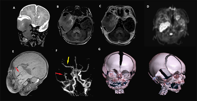 A newborn boy, delivered vaginally at 40 weeks and 2 days gestation at home under the care of a midwife to a 28-year-old gravida 2 para 2 mother, was noted to have bleeding from his oral cavity at birth. Prenatal care was adequate and the pregnancy was uncomplicated, with no concerning findings noted on 20-week ultrasound. The patient was brought to the hospital for evaluation and was admitted to the neonatal intensive care unit. The pediatric otolaryngology service was consulted, and examination revealed fullness of the right temporal fossa with absence of a portion of the squamous temporal bone. A mass of the right oropharynx was noted directly posterior to the tonsil, and the soft palate and uvula were asymmetric, resembling a shallow cleft. Despite this, the patient was breathing comfortably without evidence of respiratory distress. Magnetic resonance imaging (MRI) of the skull base revealed a large cystic and solid extra-axial mass in the right middle cranial fossa, displacing the right temporal lobe and extending into the right infratemporal fossa through a large skull base defect, as well as cleft palate. Furthermore, the mass protruded into the oropharynx (Figure 1A). The adjacent brain parenchyma appeared radiologically separate from the mass. The mass had signal intensity resembling brain parenchyma except for faint enhancement at the center and diffusion restriction in the infratemporal component (Figure 1B–D). The vascular supply of this mass appeared separate from the adjacent brain with its own feeding vessel and distal perfusion (Figure 1E–F). MRI sequences demonstrating diffusion restriction suggested this lesion could represent a malignancy. However, the lesion did not invade adjacent structures and appeared to induce bony erosion not by infiltration but by resorption and remodeling (Figure 1G). Therefore, a benign diagnosis was favored.