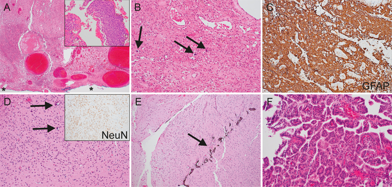 Figure 2. Histopathological analysis. Oropharyngeal biopsy (A–C): Low- (A) and high- (B) power hematoxylin and eosin-stained sections demonstrate widespread ulceration (*) of the lining squamous epithelium (inset), hyalinized ectatic vessels, and reactive glioneuronal tissue (arrows indicate calcospherites). Glial fibrillary acidic protein (GFAP) confirms a dominant glial component (C). Resection of the intracranial mass (D-F) further substantiates the malformed nature of the glioneuronal tissue (D, arrows indicate calcospherites; inset highlights the disorganized arrangement of neurons by NeuN immunostaining), as well as, pigmented ocular epithelium (arrow, E) and unremarkable fragments of choroid plexus (F). Whole exome sequencing and RNA-sequencing of the oropharyngeal biopsy were performed by Caris Life Sciences. Whole exome sequencing revealed no pathogenic gene alterations or whole arm chromosomal alterations. A number of variants of uncertain significance and unclassified gene variants with variant allele frequencies approximating 50 % were detected, suggestive of germline alterations. Additionally, uncharacterized fusions of UMAD1::GLCCI1 and KANSL1::ARL17A were detected through RNA-sequencing, the significances of which are unclear but which are possibly germline1. Karyotype analysis, performed using whole exome sequencing, identified duplications of the centromeric portion of chromosome 22, as well as the distal portion of chromosome 22q. No chromosomal losses were detected. Microsatellite status was stable, genomic loss of heterozygosity was 1 %, and tumor mutational burden was 2 mutations / megabase (MB). Overall, the genetic analyses were consistent with a non-neoplastic process. The term glioneuronal heterotopia / ectopia encompasses microscopic, small nodular or large mass-like ectopic neuroectodermal tissue, both within or outside of the neuraxis2. A well-recognized example of ectopic glioneuronal tissue is the intranasal or extranasal “nasal glioma”2–5. Intraparenchymal, dural / leptomeningeal, intracranial extracerebral, and “distal” (e.g. orbit, palate, middle ear, internal auditory canal, oral cavity, oropharynx, and lung) locations are also possible2,3,6–8. Mass-like glioneuronal heterotopias are uncommon developmental malformations and can be difficult to distinguish from primary central nervous system (CNS) neoplasms on radiologic and pathologic evaluation. While microscopic glioneuronal heterotopia likely result from aberrant glial and neuronal migration9, the pathogenesis of large mass-like glioneuronal heterotopia is less well understood. Possible etiologies include aberrant sequestration of embryonic tissue during development with subsequent dysregulated growth versus encephalocele with obliteration of the connecting stalk5. IEGH most commonly occurs in the middle cranial fossa, with fewer than 20 cases reported in the literature and even fewer reports of extracranial extension2,3,6,10–23. Literature review of published IEGH cases has been previously performed2,3,6,10,23. The association of IEGH with craniofacial anomalies, such as cleft palate, implies an origin during early embryogenesis, likely during the 5th to 6th week of gestation, possibly via evagination of a third inferior telencephalic vesicle, in the case of middle cranial fossa lesions24. Patients typically present within the first six months of life, and many are identified via prenatal ultrasonography, although cases in older children have been documented2,3,6,17,24,25. The recommended management for IEGH is staged resections, beginning with the intracranial component3,25. It is important to recognize these lesions as they are benign. Grossly, the lesions are often large and cystic2,3,6,10. Histological examination of previous cases has yielded similar findings as the case presented here; namely, disorganized neuroglial tissue (variably mature neurons, astrocytes, and oligodendrocytes) with scattered calcospherites, and the presence of other CNS tissue elements including leptomeninges, ependyma, choroid plexus, and ocular pigmented epithelium2,3,6,10,11. In some cases, cortical or cerebellar architectural patterns are evident2,10,22. To our knowledge, this is the first example of IEGH with genetic / molecular analysis performed. In contrast to a recent case series of nasal glioma5, this case showed no whole arm chromosomal gains or losses. Overall, the condition appears to have excellent prognosis after resection, including normal neurologic development3,13,25. However, complications related to airway obstruction are possible7,15,16. The infant in this case is doing well at 10 months of age, with normal development and without evidence of growth of the residual oropharyngeal mass. Conflicts of Interest Statement The authors have no conflicts of interest to report. Funding Statement The authors have no relevant funding sources to disclose. References 1 .Zhou JX, Yang X, Ning S, et al. Identification of KANSARL as the first cancer predisposition fusion gene specific to the population of European ancestry origin. Oncotarget. Aug 01 2017;8(31):50594-50607. https://doi.org/10.18632/oncotarget.16385 2 .Oya S, Kawahara N, Aoki S, et al. Intracranial extracerebral glioneuronal heterotopia. Case report and review of the literature. J Neurosurg. Jan 2005;102(1 Suppl):105-12. https://doi.org/10.3171/ped.2005.102.1.0105 3 .Abel TJ, Chowdhary A, Thapa M, et al. Ectopic glioneuronal tissue in the middle cranial fossa region. Report of four cases. J Neurosurg Pediatr. Mar 2009;3(3):188-96. https://doi.org/10.3171/2008.12.PEDS0892 4 .Husein OF, Collins M, Kang DR. Neuroglial heterotopia causing neonatal airway obstruction: presentation, management, and literature review. Eur J Pediatr. Dec 2008;167(12):1351-5. https://doi.org/10.1007/s00431-008-0810-2 5 .Gilani A, Kleinschmidt-DeMasters BK. Histopathologic features of nasal glial heterotopia (nasal glioma). Childs Nerv Syst. Jan 2022;38(1):63-75. 