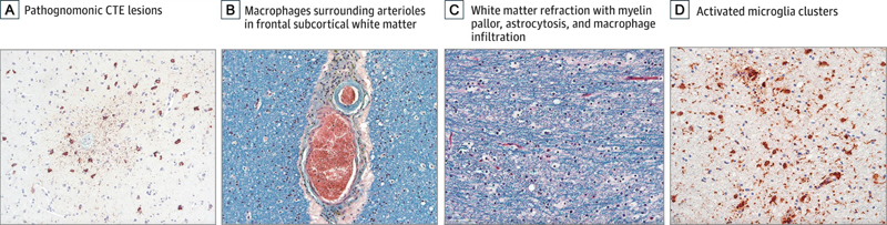 1. Chronic traumatic encephalopathy in young athletes’ post-repetitive head impacts Concussions are extremely prevalent, especially among individuals exposed to repetitive head impacts (RHIs) through contact sports, military service, intimate partner violence, and other means. While these impacts may be symptomatic or asymptomatic in the short term, long-term exposure can lead to severe neurological outcomes, including chronic traumatic encephalopathy (CTE), a degenerative brain disease with varied clinical and neuropathological features. Most research on RHI has focused on older populations, leaving a critical gap in our understanding of how RHIs affect younger individuals. Investigating changes in young athletes is crucial, as it may uncover underlying mechanisms for neuropsychiatric symptoms and identify early triggers for tau accumulation and associated toxicity, potentially informing preventive strategies and interventions. A study by McKee et al. published in JAMA Neurology investigates the neuropathologic and clinical consequences of repetitive head impacts (RHIs) in young contact sport athletes (McKee et al., 2023). Analyzing data from 152 brain donors younger than 30 years from the UNITE Brain Bank, the study characterized the presence and extent of chronic traumatic encephalopathy (CTE) and other neuropathologic abnormalities. The authors found that 41.4 % of the athletes showed neuropathological changes diagnostic for CTE, predominantly mild (stages I or II). Notably, athletes with CTE were more likely to be older and have longer exposure to RHI, particularly American football. CTE positive subjects showed key neuropathologic features, including ventricular enlargement, cavum septum pellucidum, thalamic notching, and the presence of perivascular pigment-laden macrophages in the frontal white matter (Figure 1). Further, the study also examined the clinical symptoms reported by informants using standardized scales, showing that cognitive, behavioral, and mood disturbances were prevalent among the brain donors, regardless of CTE status. Common symptoms included executive dysfunction, impulse control issues, depression, and apathy. This study provides critical insights into the early manifestations of CTE and other brain pathologies in young athletes, emphasizing the need for prospective studies to better understand the specific impacts of RHIs. The study's findings are potentially pivotal for developing strategies to mitigate the long-term effects of RHIs in contact sports. Figure 1: Neuropathological changes in young contact sports athletes