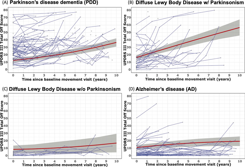 A. Immunohistochemistry for hyperphosphorylated tau showing the pathognomonic perivascular lesion. B. LH&E showing robust perivascular hemosiderin deposition in the white matter. C. LH&E demonstrating white matter rarefaction. D. Activated microglial clusters are prominent. Reproduced with modifications under the terms of the CC-BY License (http://creativecommons.org/licenses/by/4.0/). 2. Hippocampal sclerosis with TDP-43 inclusions following repetitive head impacts Hippocampal sclerosis of aging, characterized by neuronal loss and gliosis primarily in the CA1 region and occurring independently of hypoxic-ischemic injury, is prevalent in the aging population. Most cases also exhibit inclusions positive for transactive response DNA-binding protein with 43 kDa (TDP-43), a protein that, since its identification as the primary inclusion in amyotrophic lateral sclerosis (ALS) and frontotemporal lobar degeneration (FTLD), has been linked to other disorders including Alzheimer's disease (AD), limbic age-related TDP-43 encephalopathy neuropathologic change (LATE-NC), and chronic traumatic encephalopathy (CTE). The association with CTE is particularly notable and understudied, raising questions about whether these conditions represent co-morbidities or if they have synergistic effects. A study by Nicks et al. published in Acta Neuropathologica directly addresses the neuropathological association between repetitive head impacts (RHI), chronic traumatic encephalopathy (CTE), and the presence of TDP-43 inclusions and hippocampal sclerosis (HS) (Nicks et al., 2023). The researchers analyzed brain samples from 401 participants with a history of RHI and neuropathologically diagnosed CTE and compared them with 33 individuals diagnosed with HS without CTE. The study found that HS was present in 23.4 % of the CTE cases and that TDP-43 inclusions were present in 43.3 % of the CTE cases. Notably, HS in CTE occurred at a younger mean age (77 years) and was significantly associated with a longer history of contact sports exposure compared to CTE without HS. TDP-43 inclusions were frequently observed in the frontal cortex and often co-occurred with limbic TDP-43 pathology. Structural equation modeling demonstrated a significant association between years of RHI exposure and the presence of hippocampal TDP-43 inclusions through increased CTE stage. The study also showed that TDP-43 inclusions in CTE were predominantly limbic but also involved the frontal cortex, distinguishing it from typical age-related TDP-43 pathologies such as LATE-NC. The presence of TDP-43 inclusions in the hippocampus was significantly associated with HS in CTE, suggesting a pathogenic link between repetitive head impacts, CTE pathology, and the development of TDP-43 proteinopathy and HS. These findings highlight the importance of considering RHI history in the assessment of hippocampal sclerosis and suggest potential therapeutic targets for mitigating the effects of RHI on neurodegeneration. 3. Longitudinal motor decline in diffuse Lewy body disease, Parkinson’s disease with dementia, and Alzheimer’s disease Lewy bodies, a common neuropathological finding, are the hallmark of Parkinson's disease (PD) when localized to the substantia nigra, but they can progress to a diffuse pattern leading to Parkinson's disease dementia (PDD). When Lewy bodies are found in the neocortex and associated with dementia as the presenting symptom, this condition is termed diffuse Lewy body disease (DLBD). In patients with DLBD, extrapyramidal parkinsonian features may or may not develop. Lewy bodies are also seen in Alzheimer's disease (AD). However, the extent to which the rates of extrapyramidal motor decline progress in these different contexts is unclear due to the limited number of longitudinal studies with neuropathological endpoints, which are crucial for prognostication, clinical trial design, and further research. A study by Choudhury et al. published in Alzheimer’s & Dementia investigates the progression of motor deficits in dementia with Lewy bodies (DLB), Parkinson’s disease dementia (PDD), and Alzheimer’s disease dementia (AD) using data from the Arizona Study of Aging and Neurodegenerative Disorders (Choudhury et al., 2023). The study included 193 participants with autopsy-confirmed diagnoses: 98 with PDD, 48 with DLB, and 47 with AD. Within the DLB cohort, participants were further categorized into those with parkinsonism (DLB+) and without parkinsonism (DLB-). The researchers utilized the Unified Parkinson’s Disease Rating Scale (UPDRS) parts II and III to assess motor function over an eight-year period, employing non-linear mixed effects models to analyze the data. The results revealed that motor deficits progressed most rapidly in the DLB+ group, with significant worsening in gait and limb bradykinesia compared to PDD and other groups (Figure 2). The study found that baseline UPDRS-II and III scores were highest in the PDD group, followed by DLB+, AD, and DLB-. Over time, the DLB+ group showed a faster progression in UPDRS-III scores compared to PDD, driven by significant declines in gait and limb bradykinesia. The study also highlighted that the presence of parkinsonism in DLB (DLB+) was associated with more rapid motor decline than in DLB- or AD, emphasizing the importance of recognizing and monitoring these symptoms for better clinical management and prognostication. The findings underscore the need for targeted interventions to address motor deficits and suggest that patients may benefit from specific therapeutic strategies aimed at mitigating motor decline. The research provides valuable insights into the differential progression of motor impairments in neurodegenerative dementias, with implications for clinical trial design and patient care. Figure 2: UPDRS-III total scores during off stage examination for each participant and their trajectories for groups