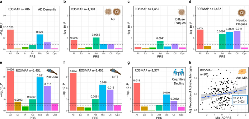PDD (A), DLB+ (B), DLB− (C), and AD (D). Each point represents one movement exam visit and corresponding score. Blue lines depict each participant. Red line represents a mixed model fit line. The shaded area (funnel) surrounding red fit line represents 95 % confidence interval for the mixed model fitted curves. AD, Alzheimer’s disease; DLB+, DLB with parkinsonism; DLB−, DLB without parkinsonism; DLB, dementia with Lewy bodies; PDD, Parkinson’s disease dementia. Reproduced with modifications under the terms of the CC-BY License (http://creativecommons.org/licenses/by/4.0/). 4. Cell-type-specific Alzheimer’s polygenic risk scores Large-scale genetic studies have uncovered numerous genetic loci associated with Alzheimer's disease (AD), but understanding how the corresponding causal genes contribute to the cellular and molecular mechanisms driving AD remains a major challenge. Since neurodegeneration in AD is a complex, non-cell autonomous process involving interactions between multiple cell types, deciphering how these genes act across different cells is essential for identifying therapeutic targets. Genes expressed by microglia and astrocytes are notably over-represented in genome-wide association studies (GWAS) of AD. However, how these cell-specific genetic changes connect to the neuropathological hallmarks of AD, such as neurofibrillary tangles and amyloid plaques, and ultimately to cognitive decline, remains unclear — a critical gap in our knowledge. A study by Yang et al. published in Nature Communications investigates how cell-type-specific polygenic risk scores (ADPRS) for AD are associated with distinct pathological processes (Yang et al., 2023). By deriving ADPRS from large-scale genome-wide association studies (GWAS) and leveraging single nucleus RNA sequencing (snRNA-seq) data, the researchers assessed the impact of genetic risk localized to different brain cell types, focusing on microglia and astrocytes, on various AD endophenotypes. Using data from the Religious Orders Study and the Rush Memory and Aging Project (ROSMAP), as well as the Anti-Amyloid Treatment in Asymptomatic Alzheimer’s (A4) study, the study found that astrocytic ADPRS were primarily associated with amyloid-β (Aβ) pathology, while microglial ADPRS were linked to both Aβ and tau pathologies, as well as cognitive decline. The findings suggest that genetic risks associated with astrocytes contribute to early Aβ accumulation, whereas microglial genetic risks drive later-stage pathological changes and cognitive impairment. Yang et al. utilized causal modeling to map the contributions of cell-type-specific ADPRS to the sequence of AD pathophysiology. The study suggests that astrocytic genetic risks affect AD primarily through Aβ accumulation in diffuse and neuritic plaques, whereas microglial genetic risks have broader effects on neuritic plaques, tau neurofibrillary tangles, and cognitive decline. This was supported by data from the A4 study, which showed that microglial ADPRS were significantly associated with in vivo tau PET measures, indicating an early role in tau pathology. The research underscores the importance of considering cell-type-specific genetic risks in understanding the progression of AD and highlights potential targets for therapeutic interventions. These insights pave the way for future studies to explore genetically guided approaches to AD treatment, focusing on modulating specific glial cell functions to mitigate disease progression. Figure 3: Association of cell-type-specific AD polygenic risk scores