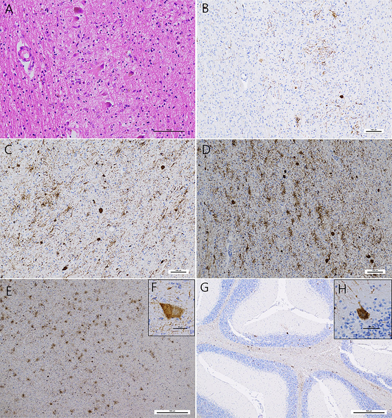 (A) In the dentate nucleus of the cerebellum, grumose degeneration was observed. (B–H) Immunohisto- chemistry for p-tau demonstrateed numerous globose-type NFTs, threads, and tufted astrocytes in the dentate nucleus (B), internal globus pallidus (C), subthalamic nucleus (D), precentral gyrus (E, F), and cerebellum (G, H). In the precentral gyrus, Betz cells were diffusely granular positive for p-tau (F). Purkinje cells were also positive for p-tau (H). HE staining (A); immunohistochemistry for p-tau (B–H). Scale bars: 100 μm in (A–D), 500 μm in (E, G), 25 μm in (F, H). Reproduced under the Creative Commons Attribution 4.0 International License (http://creativecommons.org/licenses/by/4.0/). Funding statement This work was supported by funding from the NIH (R01AG054008, R01NS095252, R01AG062348, R01NS086736, U54NS115266, U54NS115322) as well as the Rainwater Charitable Trust / Tau Consortium, the Alexander Saint Amand Scholar Award, the Karen Strauss Cook Research Scholar Award, and a generous gift from Stuart Katz and Dr. Jane Martin. Conflict of interest The author reports no conflicts of interest. Disclosure statement Generative artificial intelligence tools, specifically OpenAI's GPT-4, were used in the preparation of this manuscript. These tools assisted in drafting and refining portions of the text. The final content has been reviewed and edited by the author to ensure its accuracy, originality, and compliance with the journal's authorship and integrity guidelines. The author takes full responsibility for the content of the manuscript. References Chen, X., Firulyova, M., Manis, M., Herz, J., Smirnov, I., Aladyeva, E., Wang, C., Bao, X., Finn, M. B., Hu, H., Shchukina, I., Kim, M. W., Yuede, C. M., Kipnis, J., Artyomov, M. N., Ulrich, J. D., & Holtzman, D. M. (2023). Microglia-mediated T cell infiltration drives neurodegeneration in tauopathy. Nature, 615(7953), 668–677. https://doi.org/10.1038/s41586-023-05788-0 Choudhury, P., Zhang, N., Adler, C. H., Chen, K., Belden, C., Driver-Dunckley, E., Mehta, S. H., Shprecher, D. R., Serrano, G. E., Shill, H. A., Beach, T. G., & Atri, A. (2023). Longitudinal motor decline in dementia with Lewy bodies, Parkinson disease dementia, and Alzheimer’s dementia in a community autopsy cohort. Alzheimer’s & Dementia: The Journal of the Alzheimer’s Association, 19(10), 4377–4387. https://doi.org/10.1002/alz.13357 Grodstein, F., Leurgans, S. E., Capuano, A. W., Schneider, J. A., & Bennett, D. A. (2023). Trends in Postmortem Neurodegenerative and Cerebrovascular Neuropathologies Over 25 Years. JAMA Neurology, 80(4), 370–376. https://doi.org/10.1001/jamaneurol.2022.5416 Levine, K. S., Leonard, H. L., Blauwendraat, C., Iwaki, H., Johnson, N., Bandres-Ciga, S., Ferrucci, L., Faghri, F., Singleton, A. B., & Nalls, M. A. (2023). Virus exposure and neurodegenerative disease risk across national biobanks. Neuron, 111(7), 1086-1093.e2. https://doi.org/10.1016/j.neuron.2022.12.029 Marx, G. A., Kauffman, J., McKenzie, A. T., Koenigsberg, D. G., McMillan, C. T., Morgello, S., Karlovich, E., Insausti, R., Richardson, T. E., Walker, J. M., White, C. L., Babrowicz, B. M., Shen, L., McKee, A. C., Stein, T. D., PART Working Group, Farrell, K., & Crary, J. F. (2023). Histopathologic brain age estimation via multiple instance learning. Acta Neuropathologica, 146(6), 785–802. https://doi.org/10.1007/s00401-023-02636-3 McKee, A. C., Mez, J., Abdolmohammadi, B., Butler, M., Huber, B. R., Uretsky, M., Babcock, K., Cherry, J. D., Alvarez, V. E., Martin, B., Tripodis, Y., Palmisano, J. N., Cormier, K. A., Kubilus, C. A., Nicks, R., Kirsch, D., Mahar, I., McHale, L., Nowinski, C., … Alosco, M. L. (2023). Neuropathologic and Clinical Findings in Young Contact Sport Athletes Exposed to Repetitive Head Impacts. JAMA Neurology, 80(10), 1037–1050. https://doi.org/10.1001/jamaneurol.2023.2907 Nicks, R., Clement, N. F., Alvarez, V. E., Tripodis, Y., Baucom, Z. H., Huber, B. R., Mez, J., Alosco, M. L., Aytan, N., Cherry, J. D., Cormier, K. A., Kubilius, C., Mathias, R., Svirsky, S. E., Pothast, M. J., Hildebrandt, A. M., Chung, J., Han, X., Crary, J. F., … Stein, T. D. (2023). Repetitive head impacts and chronic traumatic encephalopathy are associated with TDP-43 inclusions and hippocampal sclerosis. Acta Neuropathologica, 145(4), 395–408. https://doi.org/10.1007/s00401-023-02539-3 Pomeshchik, Y., Velasquez, E., Gil, J., Klementieva, O., Gidlöf, R., Sydoff, M., Bagnoli, S., Nacmias, B., Sorbi, S., Westergren-Thorsson, G., Gouras, G. K., Rezeli, M., & Roybon, L. (2023). Proteomic analysis across patient iPSC-based models and human post-mortem hippocampal tissue reveals early cellular dysfunction and progression of Alzheimer’s disease pathogenesis. Acta Neuropathologica Communications, 11(1), 150. https://doi.org/10.1186/s40478-023-01649-z Yagita, K., Sadashima, S., Koyama, S., Noguchi, H., Hamasaki, H., Sasagasako, N., & Honda, H. (2024). Ribosomal protein SA is a common component of neuronal intranuclear inclusions in polyglutamine diseases and Marinesco bodies. Neuropathology: Official Journal of the Japanese Society of Neuropathology, 44(1), 31–40. https://doi.org/10.1111/neup.12927 Yang, H.-S., Teng, L., Kang, D., Menon, V., Ge, T., Finucane, H. K., Schultz, A. P., Properzi, M., Klein, H.-U., Chibnik, L. B., Schneider, J. A., Bennett, D. A., Hohman, T. J., Mayeux, R. P., Johnson, K. A., De Jager, P. L., & Sperling, R. A. (2023). Cell-type-specific Alzheimer’s disease polygenic risk scores are associated with distinct disease processes in Alzheimer’s disease. Nature Communications, 14(1), 7659. https://doi.org/10.1038/s41467-023-43132-2 Yonenobu, Y., Beck, G., Kido, K., Maeda, N., Yamashita, R., Inoue, K., Saito, Y., Hasegawa, M., Ito, H., Hasegawa, K., Morii, E., Iwaki, T., Murayama, S., & Mochizuki, H. (2023). Neuropathology of spinocerebellar ataxia type 8: Common features and unique tauopathy. Neuropathology: Official Journal of the Japanese 