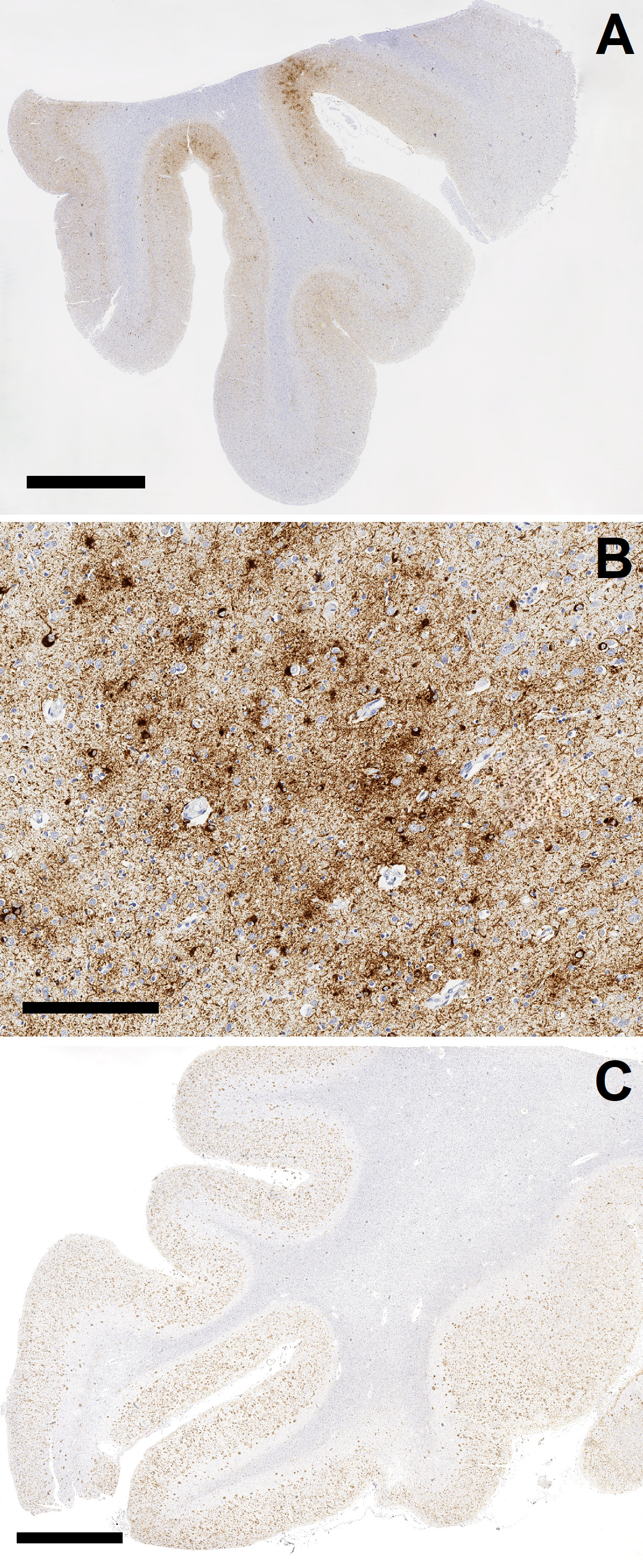 Figure 2. Chronic traumatic encephalopathy (CTE) overlap with Alzheimer disease. While we hope for a third NINDS/NIBIB Consensus effort in the near future that could begin to address this unresolved issue, in 2023 authors Sorrentino et al. investigated a solution and wrote a brief manuscript detailing a study in which they used an immunohistochemical panel of multiple antibodies for p-tau on diagnostic material from a small series of cases of AD, CTE, PSP, and controls.20 Antibodies utilized in the panel included AT8 (p-tau at S202 and T205), AT180 (p-tau at T231), PHF1 (p-tau at S396 and S404), and MC1, which is an antibody specifically raised against p-tau in AD.21 The authors found little discernable difference in cases of AD, CTE, and PSP labeled with AT8, AT108, and PHF1. However, interestingly, MC1 immunostaining was minimal to absent in cases of CTE and PSP in comparison to the strong staining identified in the AD case as rated subjectively and also calculated by assessment of p-tau inclusions per three 10x microscopic fields (p = ≤ 0.0002). In this study, the authors demonstrate evidence that the conformation of p-tau in AD is sufficiently different so as to potentially allow the differentiation of AD from other tauopathies, importantly CTE, through the use of MC1 immunohistochemistry. This study, though small, therefore provides promise for a simple and practical means to potentially address major diagnostic issues concerning CTE when concurrent with multiple tauopathies. More investigation with mixed cases is needed, particularly given that, at the time of this writing, the discussion regarding mixed neurodegenerative pathologies in brains from individuals exposed to repetitive TBI continues to grow.22 The relationship between TBI, CTE, and TDP43 pathology TDP43 pathology has been described in a relatively small number of mostly advanced CTE cases, including descriptions of neocortical deposits (sometimes at sulcal depths, coincident with CTE pathognomonic lesions) as well as deposits in limbic structures, sometimes coincident with hippocampal sclerosis (HS).23-27 As it concerns CTE with concurrent limbic TDP43 pathology and HS, the precise relationship between these entities has been uncertain, as has been how limbic TDP43 pathology and HS may differ in the context of CTE versus that of aging alone (i.e., the impact of TBI on these lesions). In 2023, authors Nicks et al. published a large cohort study to begin to address this gap in knowledge.28 The authors began with a 401-case cohort of cases with CTE and known TBI history, predominantly from contact sports participation (mostly American football). The mean age of the cohort was 62.2 years, with a range of 20–100 years. The authors found evidence of TDP43 pathology in 43.3 % of the CTE cases, and HS in 23.4 % of cases. Regardless of whether or not HS was identified, TDP43 pathology was most common in the limbic regions (93 % of TDP43-positive cases), and less so in the examined frontal cortex (47 % of TDP43-positive cases, including 7 % which only had TDP43 accumulations in the frontal cortex in the absence of limbic pathology). Perhaps expectedly, the most numerically significant factor between CTE cases with and without HS was age; the average age in the CTE group with HS was 77 years (range 52–100), and without HS was 57.7 (range: 20–91). Interestingly, however, another statistically significant factor that emerged in the study was duration of contact sport participation, which was significantly longer in the CTE group with HS as opposed to without (p=0.029). As a means of comparison, the group also assessed differences between the CTE cohort and a 33-donor cohort diagnosed with HS related to aging, without a history of TBI and without CTE (average age = 86.6 years). Among the notable observations was that the CTE group with HS had a substantially greater proportion of cases with TDP43 inclusions within both limbic and frontal regions (41.5 %) in comparison to the group with HS but no CTE (18.2 %), which was particularly interesting given that the CTE group had an average age of death that was 10 years younger than the HS group without CTE. Also interesting was that the distribution of TDP43 pathology in the hippocampus differed between the groups. In the CTE group with HS, the CA1 region and dentate gyrus were statistically less likely to be involved by any TDP43 pathology, and the CA2 region was more severely involved TDP43 pathology. With this study, the authors demonstrate a high rate of TDP43 pathology in aged individuals with CTE, and provide evidence that CTE, and/or repetitive TBI, may exacerbate or accelerate age-related TDP43 pathology with or without HS, and/or may be a risk factor for the development of independent, and perhaps different, TDP43 pathology. The latter notion becomes particularly interesting when considering another 2023 article which identified TDP43 inclusions in the inner nuclear layer of 6/8 retinas from cases with CTE, and in only 1/8 of the age-matched controls.29 We are excited to see what the future holds for these new developments. Repetitive TBI elicits pathology in C9orf72 transgenic mice In our continued efforts to understand the link between amyotrophic lateral sclerosis (ALS) and frontotemporal dementia, the identification of C9orf72 hexanucleotide gene expansion as the most common genetic association between these disorders was a landmark discovery.30,31 Interestingly, links between repetitive TBI and ALS have also been suggested, and bolstered by evidence epidemiologically, which itself includes demonstrations that a history of multiple TBIs is associated with a three-fold increased risk of ALS, and that incidence and mortality from ALS is nearly four times higher in professional American football players in comparison with the general population.32-34 Questions surrounding how TBI may impact development of pathology in the setting of a known genetic risk for frontotempora