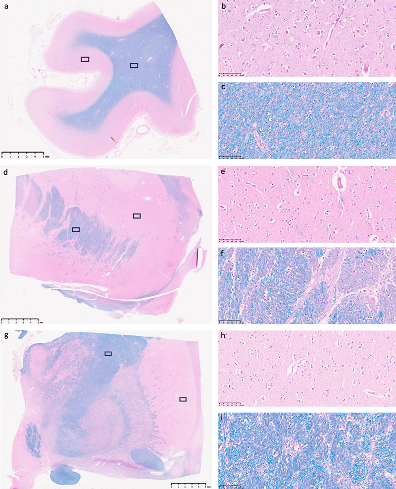 Figure 1. Representative light microscopy images from several brain region studied. LHE-stained tissue sections from the frontal cortex (a–c), anterior striatum (d–f), and posterior striatum (g–i) of an immersion-fixed hemi-sectioned brain specimen. Panel (a) shows a low-magnification overview of the frontal cortex, with black rectangles indicating regions of interest examined at higher magnification in (b) of gray matter and in (c) of white matter. Similar triads of representative images are shown for the anterior striatum (d–f) and the posterior striatum (g–i). All samples were obtained from a 63-year-old male brain donor who died of respiratory failure due to malignant mesothelioma, with a PMI of 23.6 h before tissue preservation. Scale bars in (a, d, and g) are 5 mm; scale bars in higher magnification images are 100 μm. To evaluate for potential late-stage necrosis, two reviewers evaluated the presence of ghost cells in each of three gray matter regions of interest for all the WSIs available. Any given cell may have apparent characteristics of ghost cells, because of problems with staining or visualization, with a preponderance of these aspects at late-stage necrosis (Finnie et al., 2016). Out of the 321 regions of interest (ROIs) analyzed, we identified two ROIs that appeared to potentially have a substantially elevated number of ghost cells, although this may reflect differences in staining or imaging (Figure 2). These two ROIs with elevated numbers of ghost cells were found in samples from the posterior striatum, with PMIs of 53.5 h and 70.5 h. The tissue in these ROIs may represent areas that degraded especially rapidly for an unknown reason, or that may have been differentially affected by an artifact in the processing or imaging procedure. For the other two ROIs from these two samples, there was not a substantial number of ghost cells identified. Taken together, these observations indicate that the immersion fixation procedure generally maintained the histologic architecture on light microscopy as might be expected on a biopsy sample from autopsy brain tissue, with very few or no areas exhibiting substantial cellular necrosis.