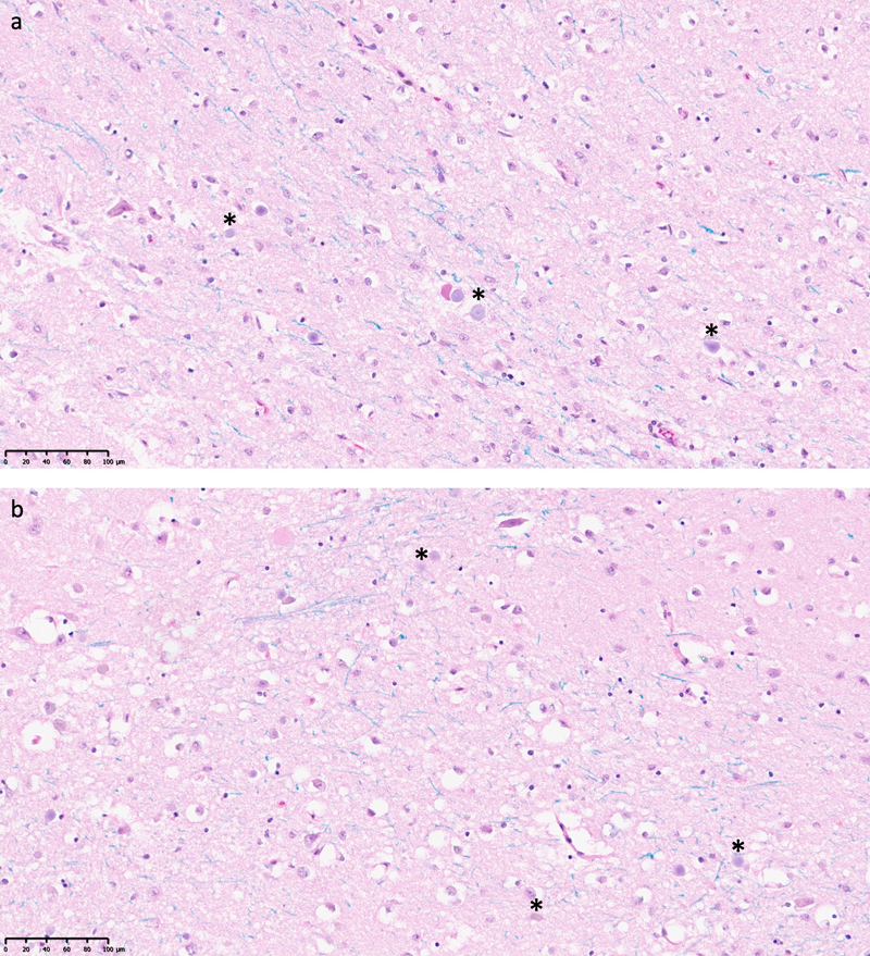 Figure 2. Light microscopy of regions of interest showing a potentially significant number of ghost cells. The regions of interest were classified as having at least three potential ghost cells identified. Ghost cells are characterized by having absent or barely visible nuclei, pale-staining cytoplasm, and indistinct cell membrane morphology. Asterisks indicate cells potentially having these characteristics. It is unclear if staining or imaging factors could also contribute to this appearance. a: LHE-stained tissue section from the posterior striatum of a 62-year-old brain donor, with a PMI of 53.5 h. b: LHE-stained tissue section from the posterior striatum of a 76-year-old brain donor, with a PMI of 70.5 h. Scale bars: 100 μm. To measure whether decomposition might vary quantitatively with PMI or across brain regions, we measured the size of pericellular and perivascular rarefaction areas (Figure 3). These rarefaction areas are common postmortem artifacts that are visible within the early postmortem period and appear to be due to the swelling of tissue elements such as astrocyte processes (Krassner et al., 2023). For each brain region sampled, we determined the arithmetic mean sizes of the pericellular and perivascular rarefaction areas measured across all three of the gray matter regions of interest selected. We found that there was no significant difference between these measures in the surface brain region studied (frontal cortex) and the two inner brain regions studied (anterior striatum and posterior striatum) (Kruskal-Wallis tests: for pericellular rarefaction, H(2) = 1.93, p = 0.381; for perivascular rarefaction, H(2) = 3.71, p = 0.156). We did not identify significant rank correlations between these measures and the PMI in any of the three brain regions studied (all |ρ| < 0.25, p > 0.05). We did find one nominally significant Pearson correlation between the pericellular rarefaction area size and the PMI in the frontal cortex (r = 0.371, p = 0.033), but this became non-significant after adjusting for multiple comparisons using the Benjamini-Hochberg false discovery rate correction (FDR-adjusted p = 0.20). Note that our pericellular and perivascular area measurements may have been influenced by 3D tissue sectioning orientation, independent of postmortem fluid accumulation. That is, it is possible that the visible space around cells and vessels varied based on the angle of the cut during sample preparation. Additionally, it is possible that an effect would have been distinguished with a larger sample size. Acknowledging these potential sources of variability, we did not identify a clear relationship between the measures of rarefaction and either the PMI or the brain region. This finding suggests that while these areas of rarefaction are consistently seen in postmortem brain tissue, they do not seem to be a linear proxy for the duration of ischemia prior to fixation, at least in this data set. These results are consistent with a model in which the rarefactions first occur due to the retrograde flow of cerebrospinal fluid occurring early in the PMI and then remain relatively stable for a period of time (Du et al., 2022; Krassner et al., 2023). It is possible that the rarefaction areas may break down in more advanced decomposition, as the cell membranes of astrocytes and other cell types begin to degrade and therefore allow water to equilibrate across the sample. This phenomenon could then be interpreted as a sign of advanced necrosis. However, we did not observe this phenomenon in the data we analyzed.